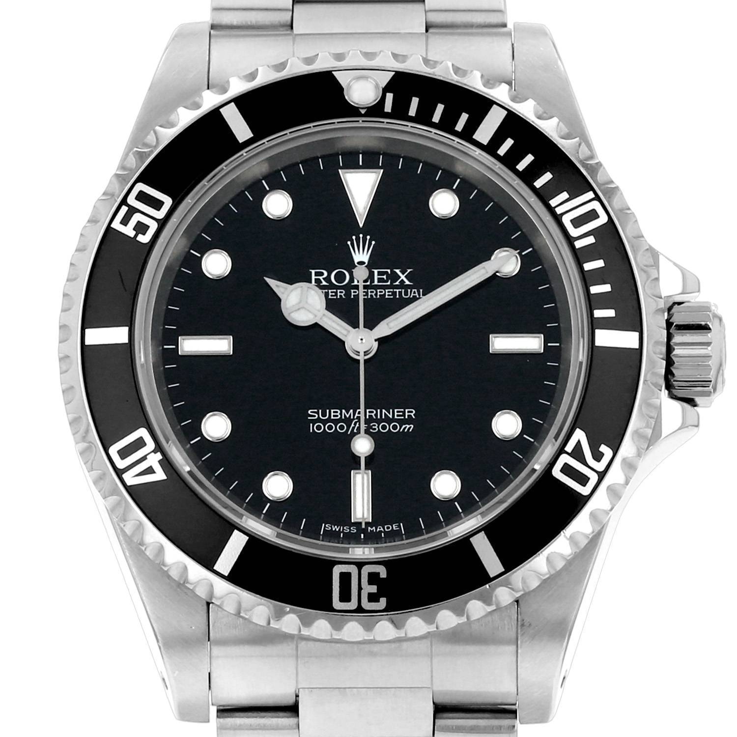 Reloj de pulsera Rolex Submariner de acero. Caja de reloj redonda de acero, fondo de caja enroscado, bisel graduado giratorio unidireccional, corona enroscada.