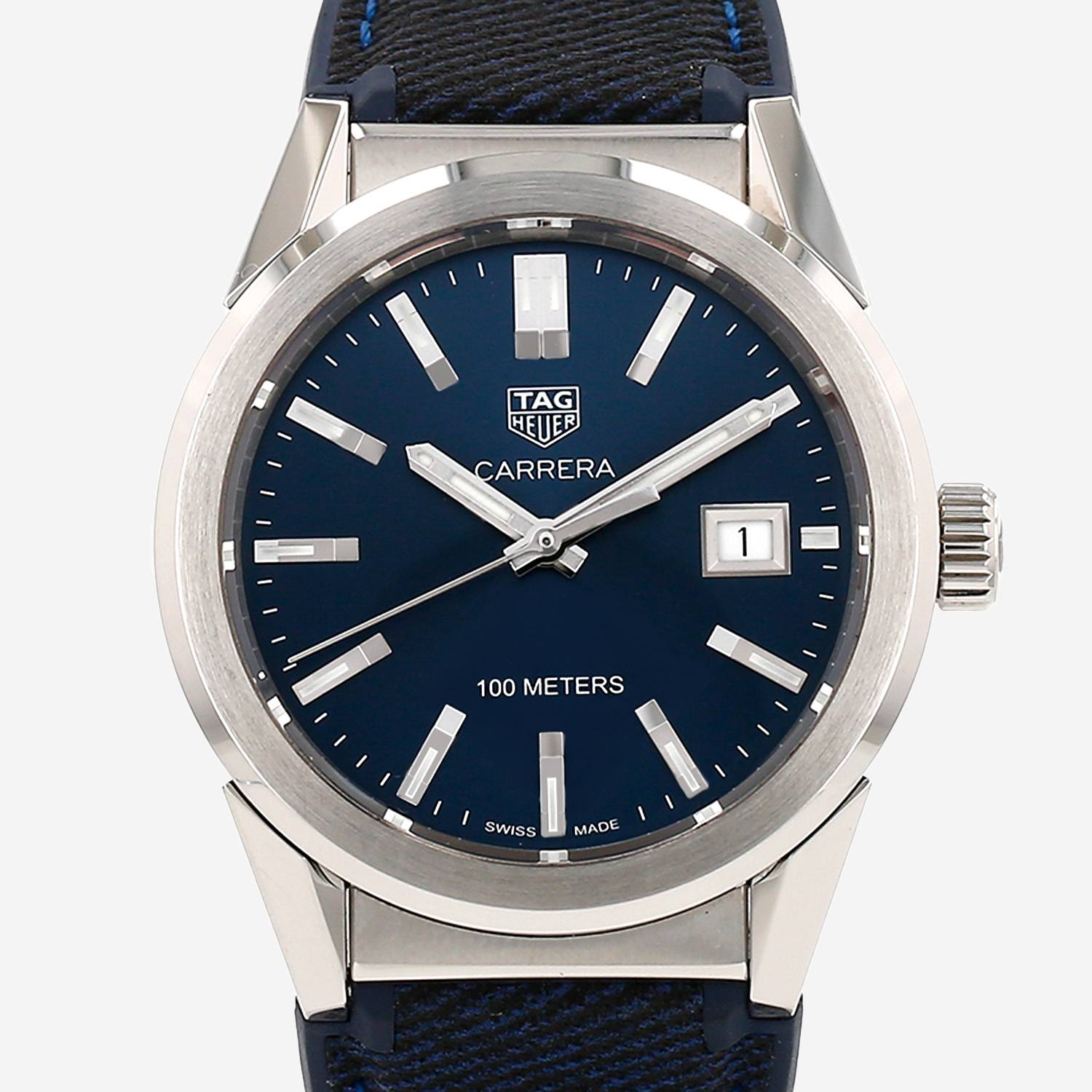 - Brazalete de caucho azul, hebilla desplegable de acero con firma Tag Heuer.