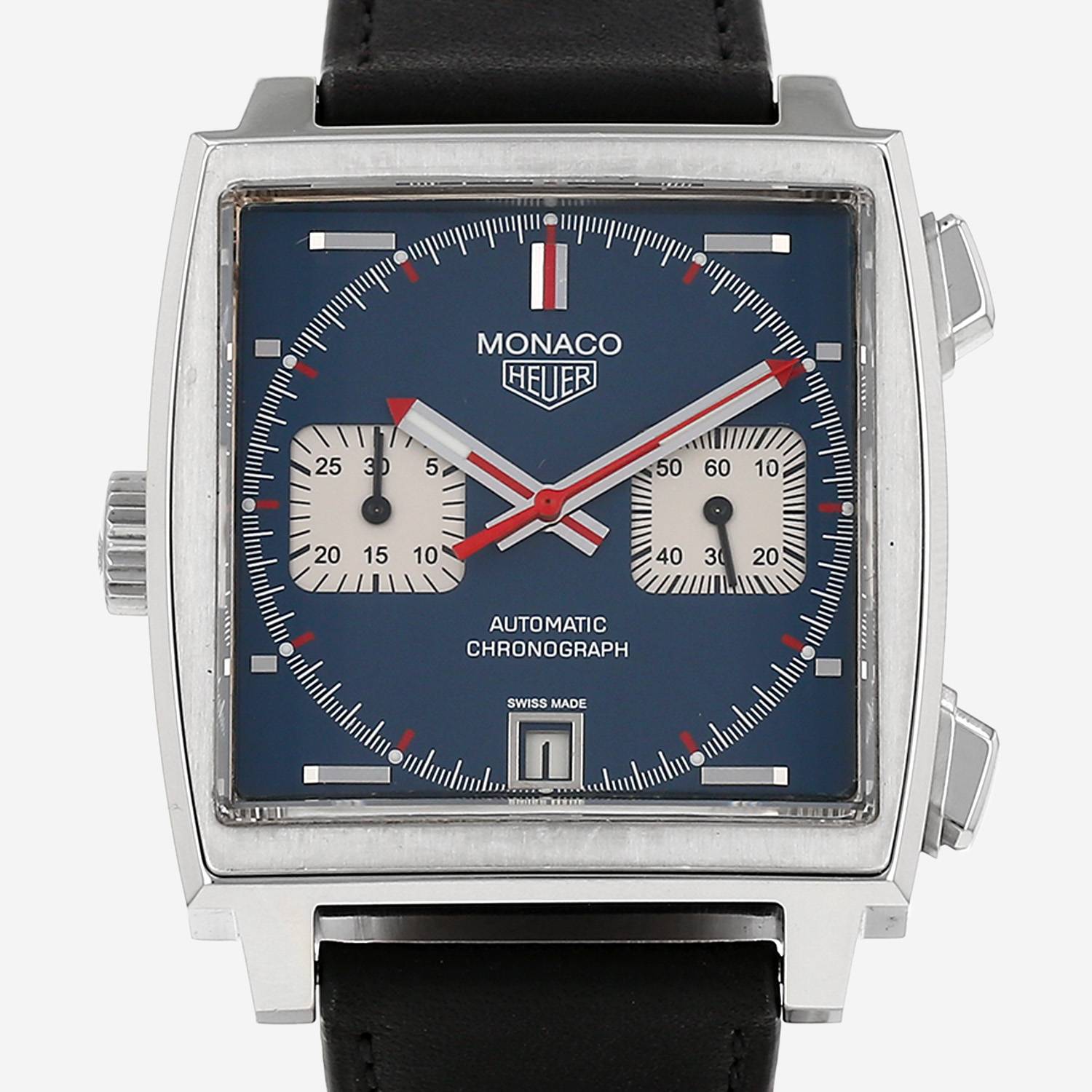 Reloj de pulsera TAG Heuer Monaco de acero. Caja de reloj cuadrada de acero, fondo de caja enroscado, pulsadores rectangulares, a las 2h y a las 4h, corona acanalada.