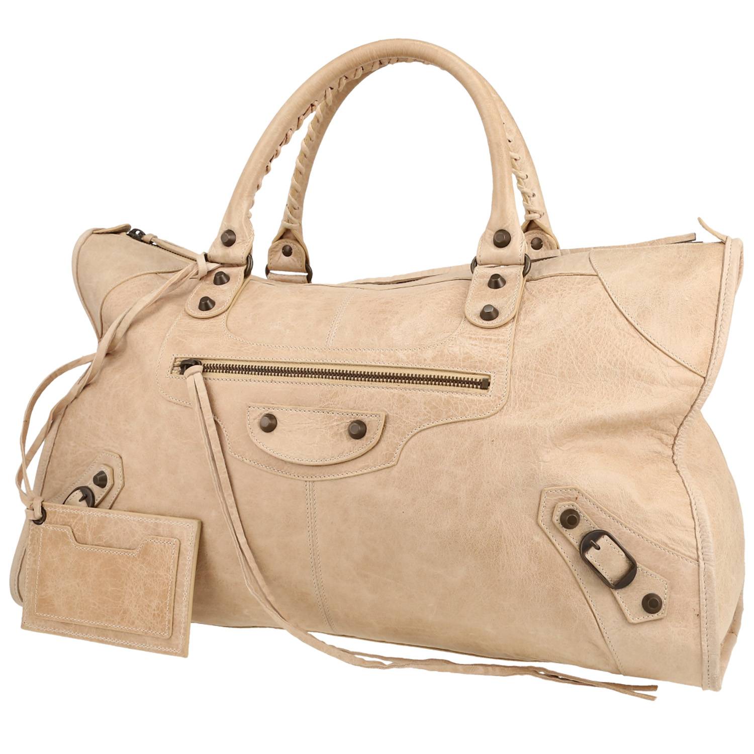 Pratica borsa weekend Balenciaga Work in pelle beige, inserti in metallo argentato invecchiato, doppio manico in pelle beige da portare a mano.