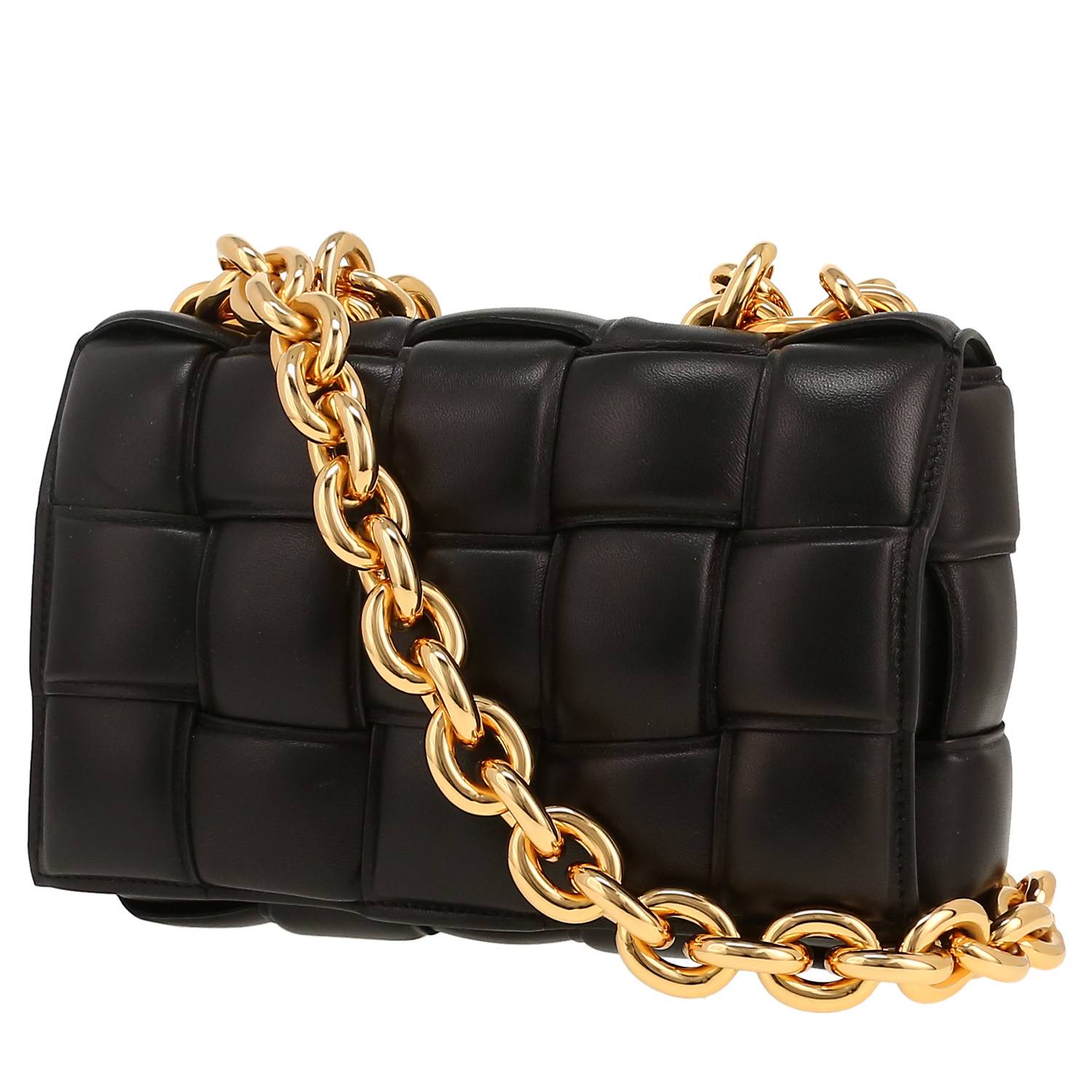 Splendida borsa a tracolla Bottega Veneta Cassette in pelle intrecciata nero, inserti in metallo dorato, manico semplice in metallo dorato, una tracolla a catena in metallo dorato da portare a mano, in spalla o a tracolla.