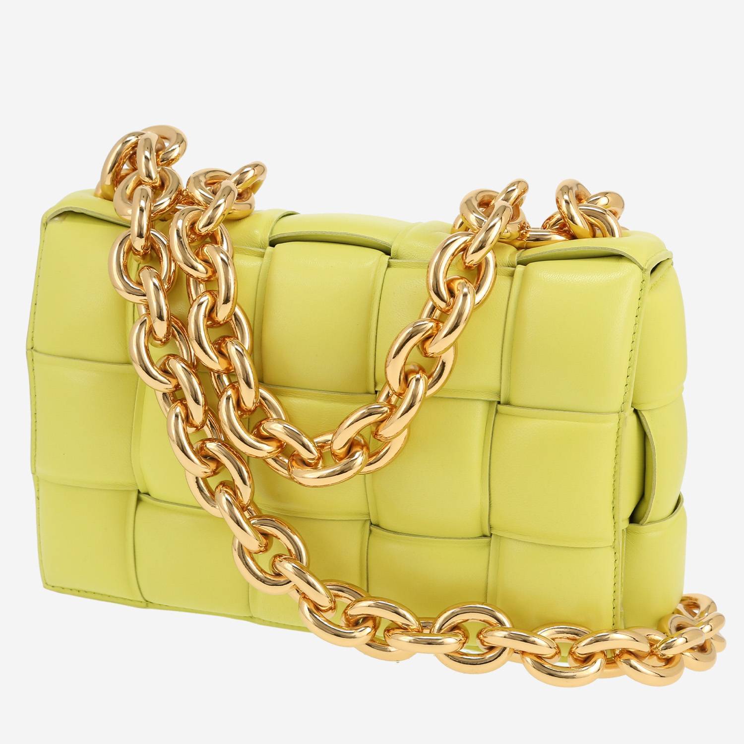 Elegante borsa a tracolla Bottega Veneta Cassette in pelle intrecciata giallo, inserti in metallo dorato, una tracolla a catena in metallo dorato da portare a mano, in spalla o a tracolla.