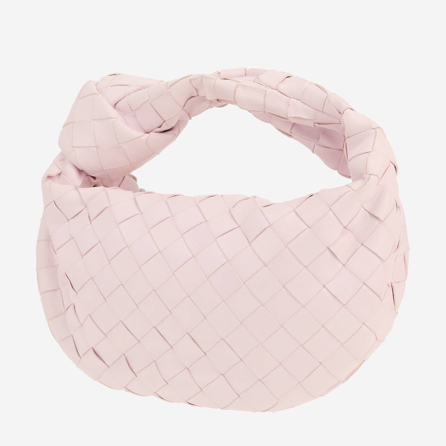 Magnifica borsa Bottega Veneta Jodie in pelle intrecciata rosa, inserti in metallo dorato, manico semplice in pelle intrecciata rosa da portare a mano.