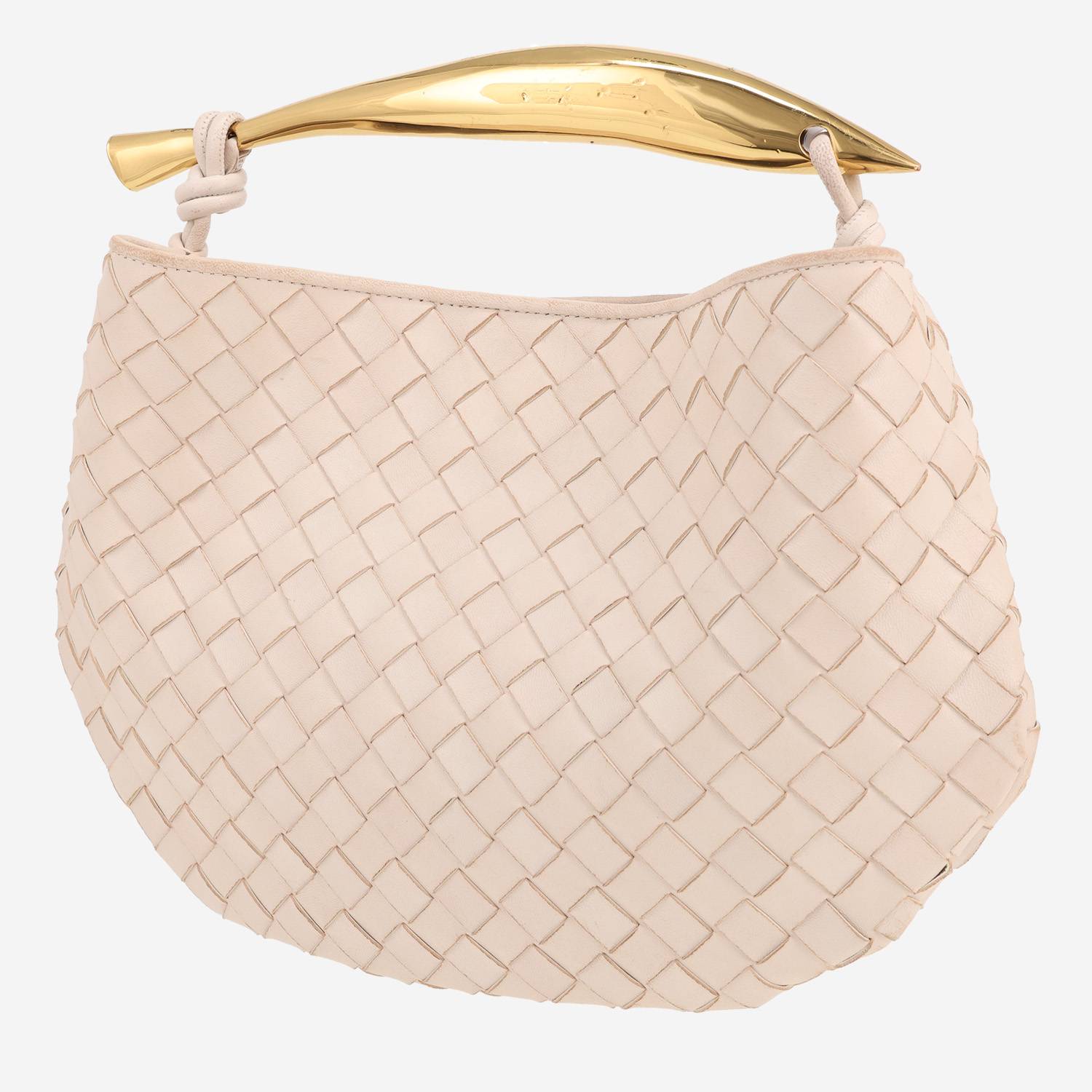 Magnifica borsa Bottega Veneta Sardine in pelle intrecciata écru, inserti in metallo dorato, manico semplice in metallo dorato da portare a mano.