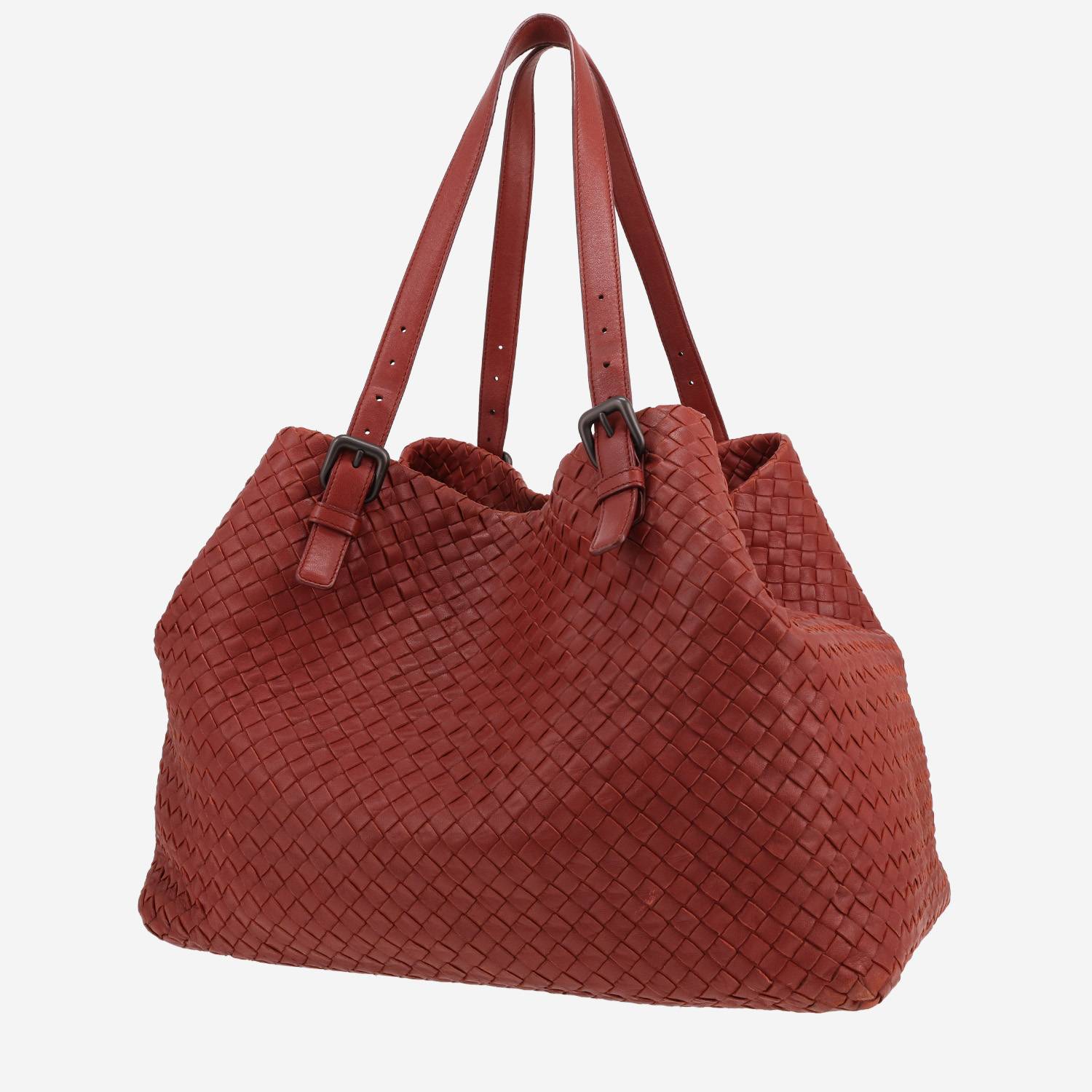 Magnifica shopping bag Bottega Veneta in pelle intrecciata rosso mattone, inserti in metallo invecchiato, doppia tracolla in pelle rosso mattone da portare a mano o in spalla.