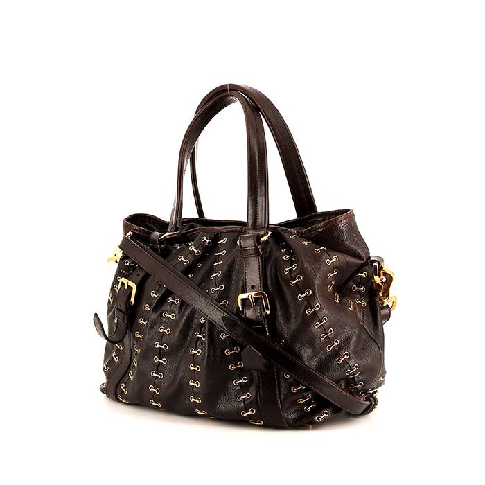 Straordinaria borsa a tracolla Burberry in pelle marrone con motivo forato e pelle verniciata marrone, inserti in metallo dorato, doppio manico in pelle marrone, tracolla rimovibile regolabile in pelle verniciata marrone da portare a mano in spalla o a tracolla.