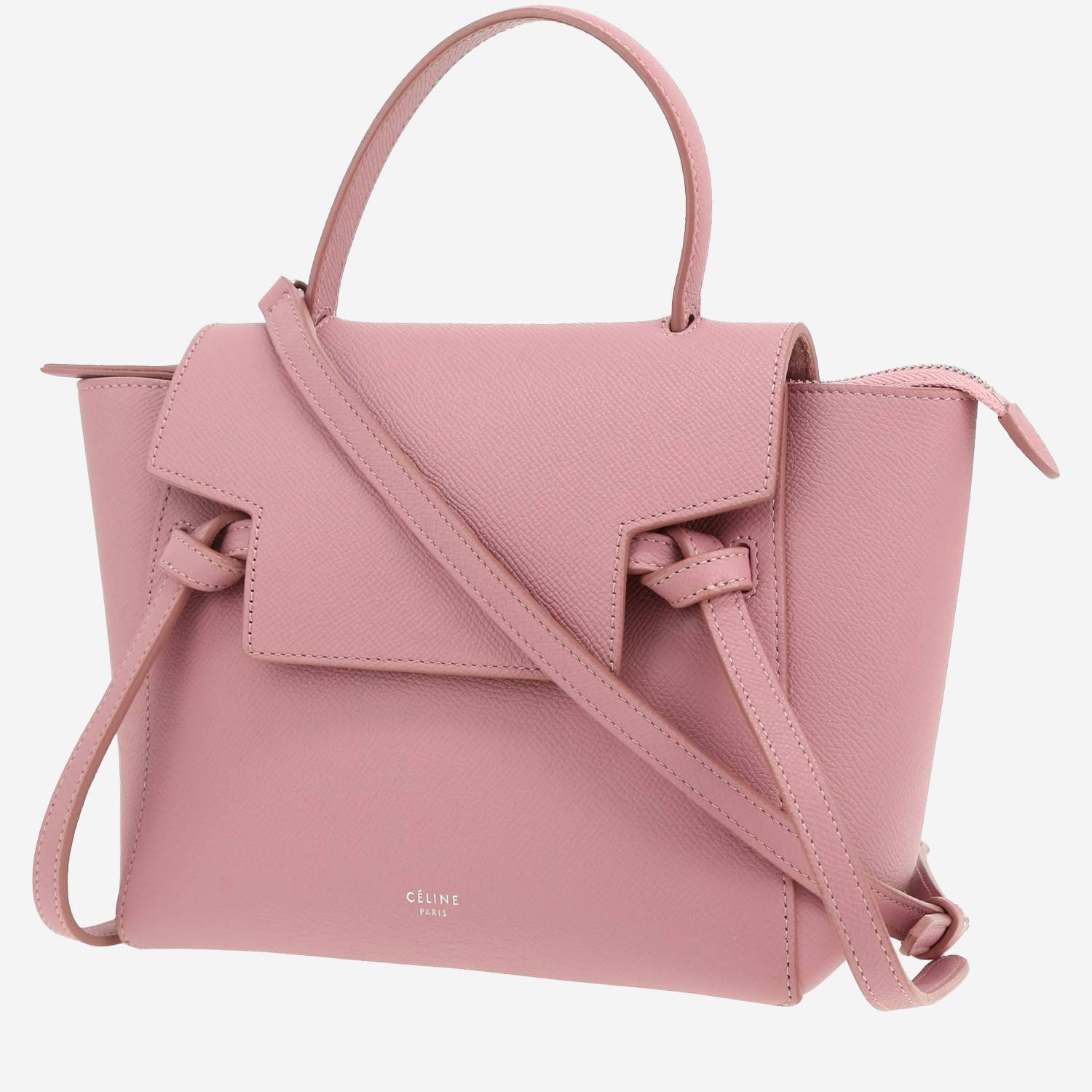 Magnifica borsa a tracolla Celine Belt Nano in pelle martellata rosa, inserti in metallo argentato, manico semplice in pelle rosa, tracolla removibile in pelle rosa da portare a mano, in spalla o a tracolla.