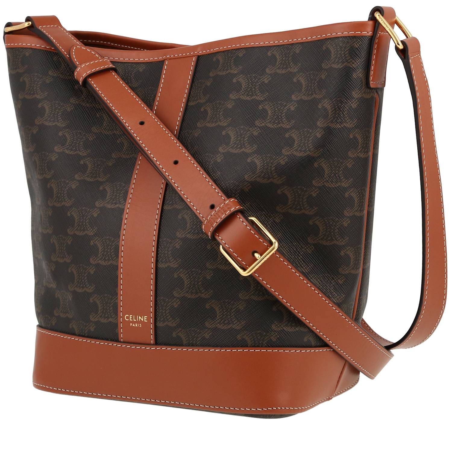 Elegante borsa a tracolla Celine Seau modello piccolo in tela monogram marrone e pelle marrone, inserti in metallo dorato, impunture bianche, tracolla regolabile in pelle marrone da portare in spalla o a tracolla.