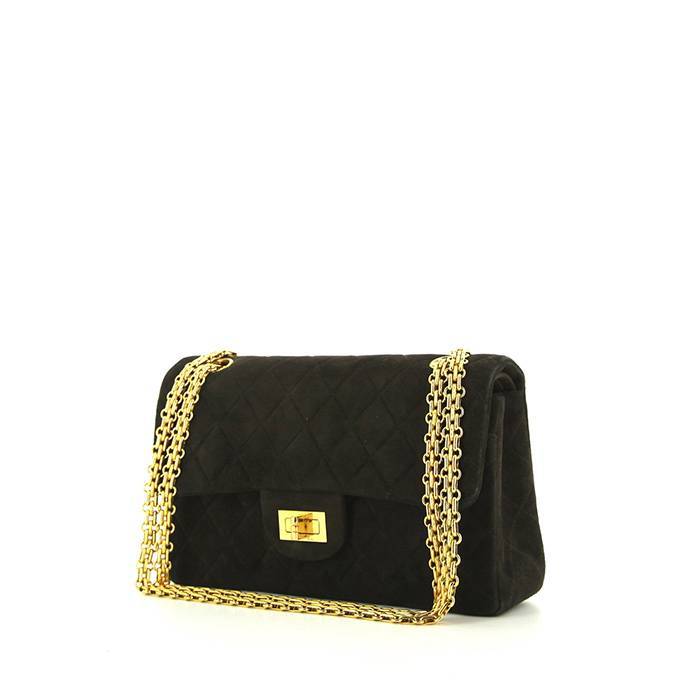 Intramontabile borsa a tracolla Chanel 2.55 in camoscio trapuntato marrone scuro, inserti in metallo dorato, una tracolla a catena in metallo dorato da portare a mano in spalla o a tracolla.