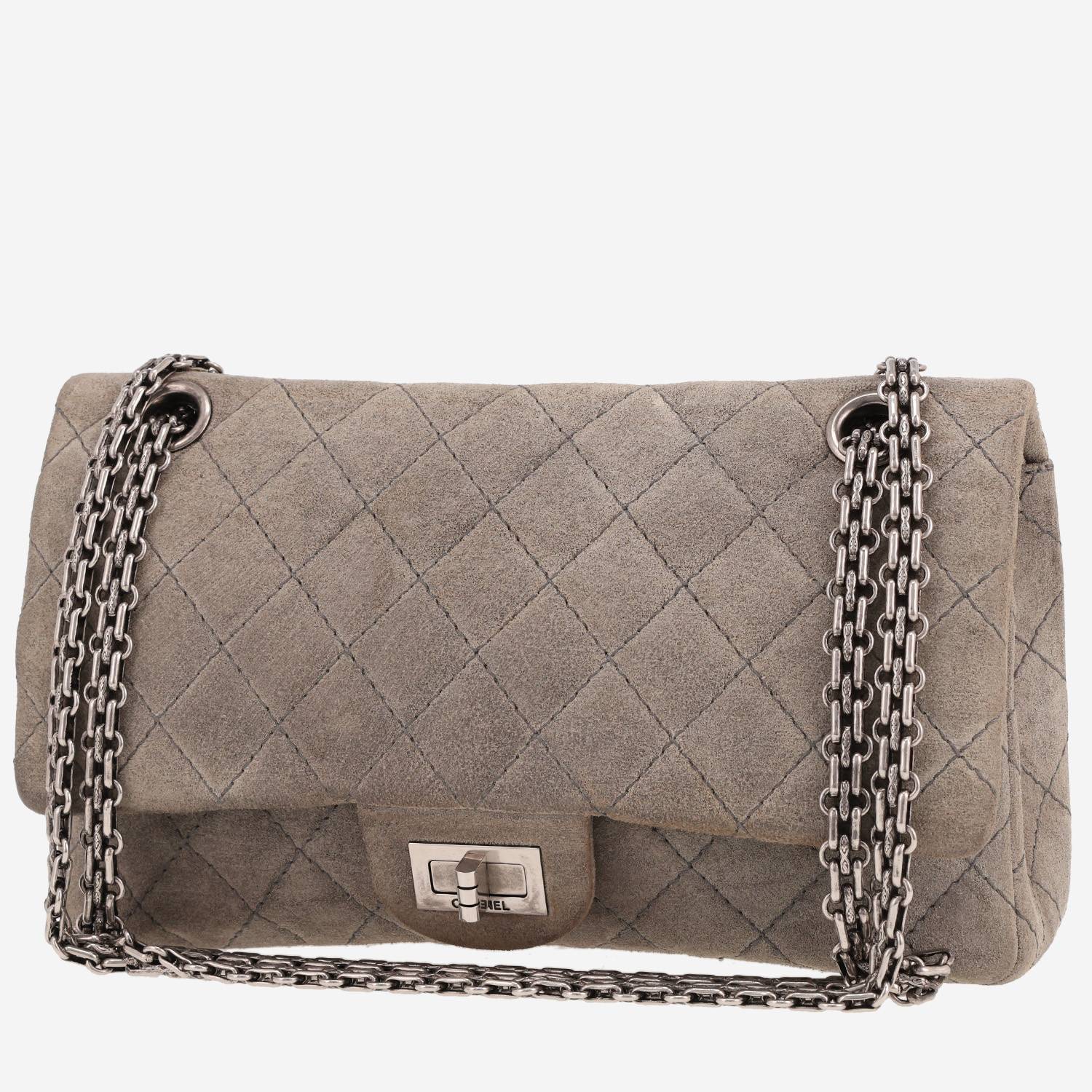 Inimitabile borsa a tracolla Chanel 2.55 in pelle di vitello doblis grigio, inserti in metallo argentato, una tracolla a catena trasformabile in metallo argentato da portare a mano, in spalla o a tracolla.