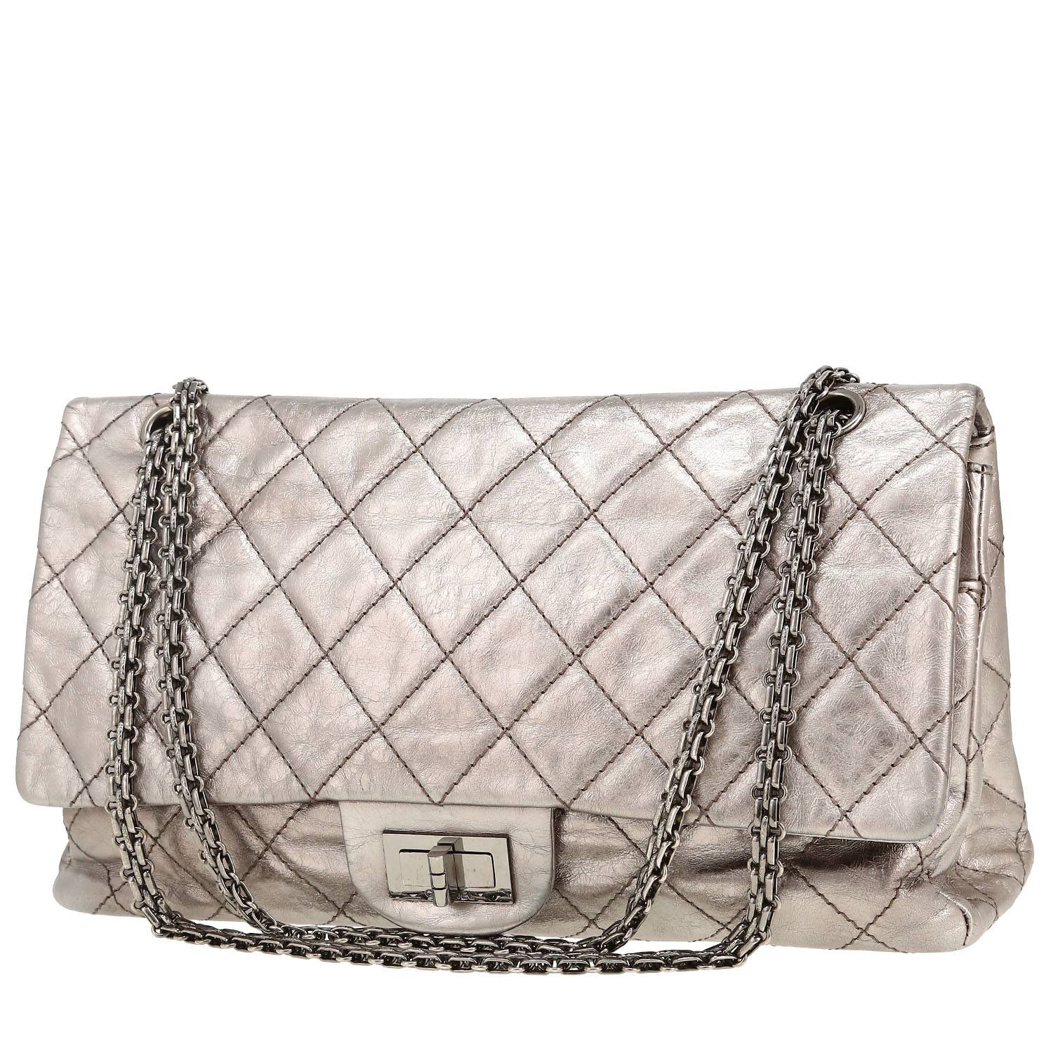 Bellissima borsa a tracolla Chanel 2.55 in pelle trapuntata argentato, inserti in metallo argentato, una tracolla a catena trasformabile in metallo argentato da portare a mano, in spalla o a tracolla.