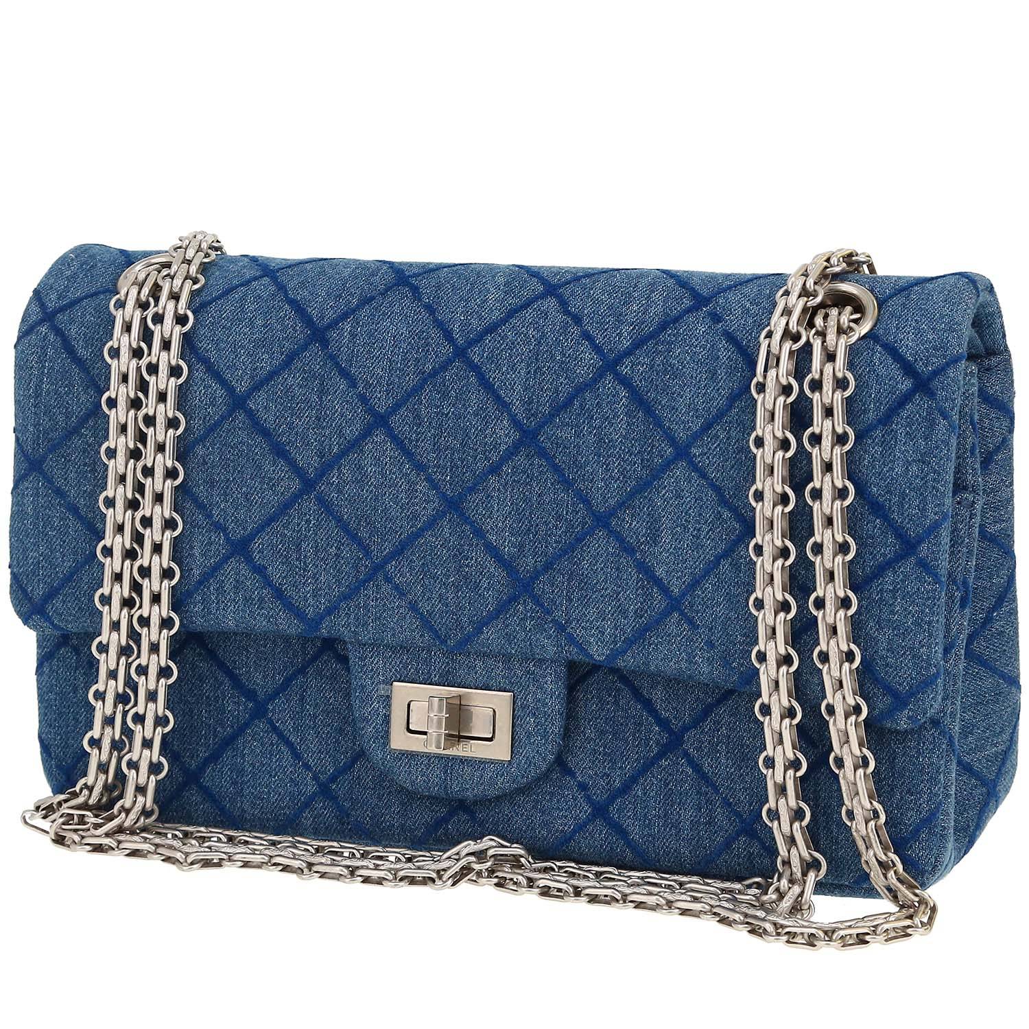 Magnifica borsa a tracolla Chanel 2.55 in tela denim blu con motivo, inserti in metallo argentato, una tracolla a catena trasformabile in metallo argentato da portare a mano, in spalla o a tracolla.