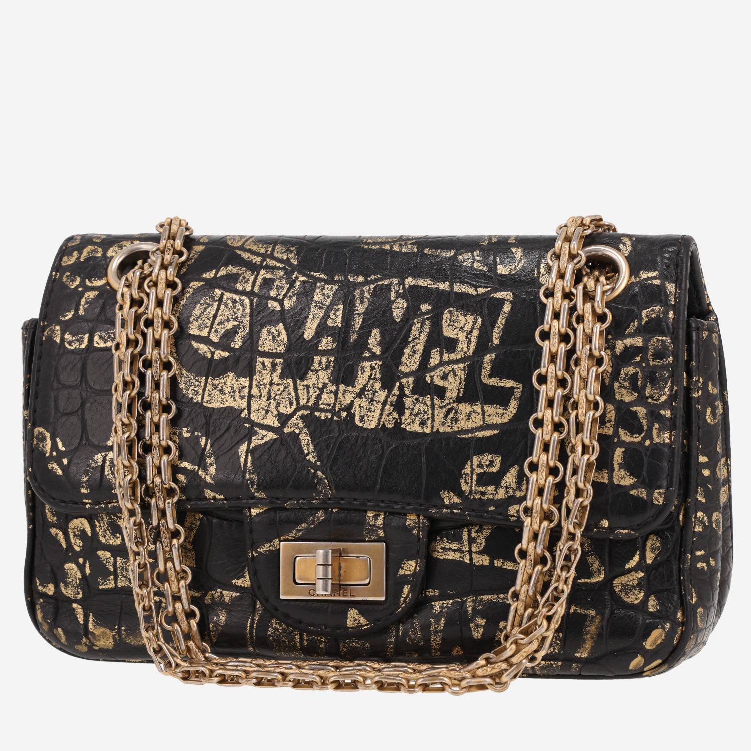 Inimitabile borsa a tracolla Chanel 2.55 mini in pelle nera e dorata simil coccodrillo, inserti in metallo dorato, una tracolla a catena trasformabile in metallo dorato da portare a mano, in spalla o a tracolla.