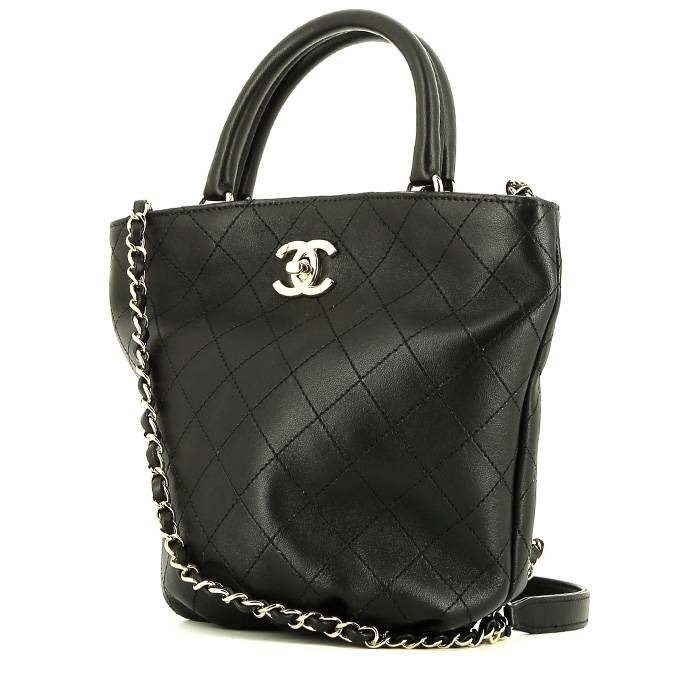 Magnifica borsa Chanel in pelle nero, inserti in metallo argentato, doppio manico in pelle nera, una tracolla a catena removibile in metallo argentato con intrecci di pelle nera da portare a mano, in spalla o a tracolla.