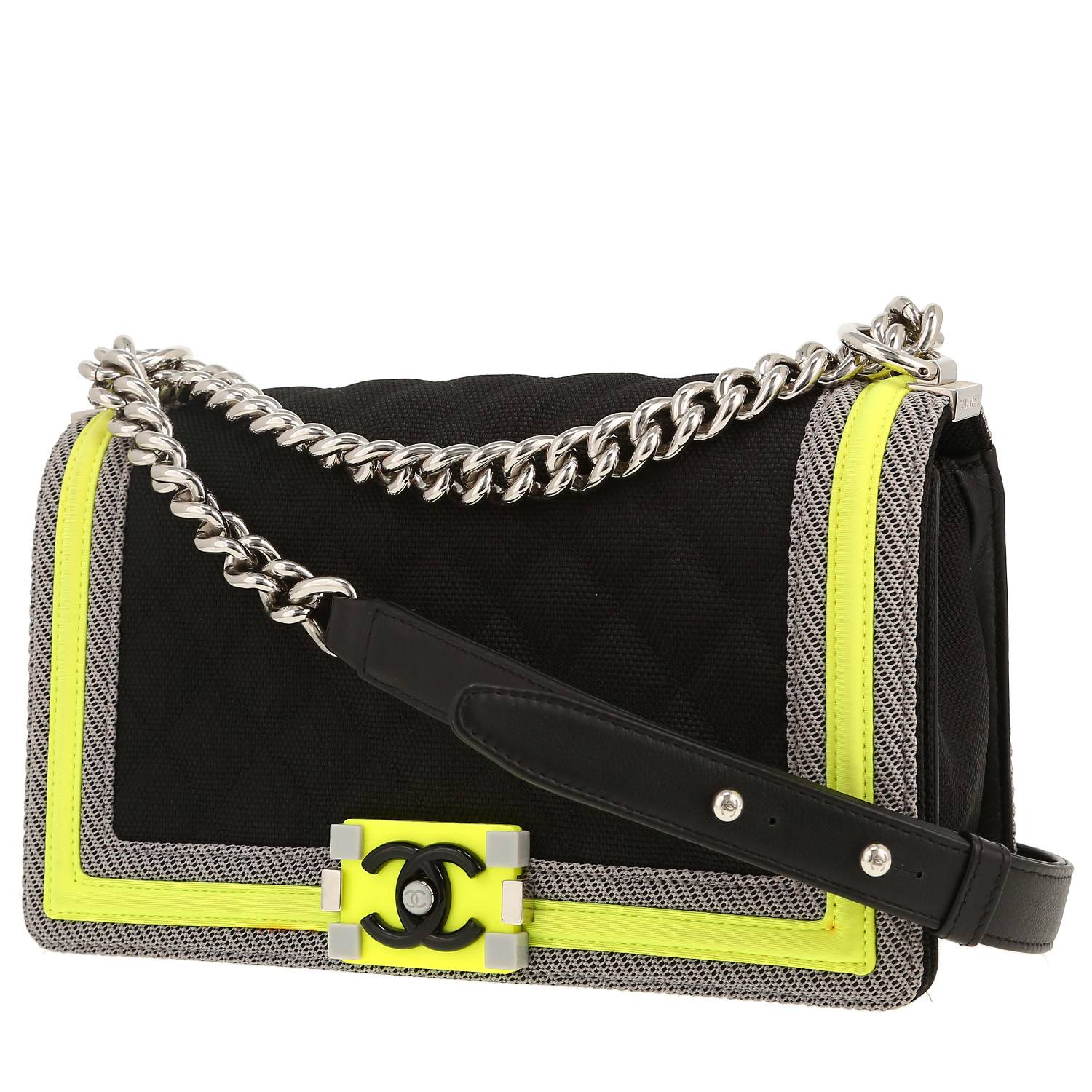 Magnifica borsa a tracolla Chanel Boy modello medio in tela grigia gialla e nera, inserti in metallo argentato, una tracolla a catena regolabile in metallo argentato da portare in spalla o a tracolla.