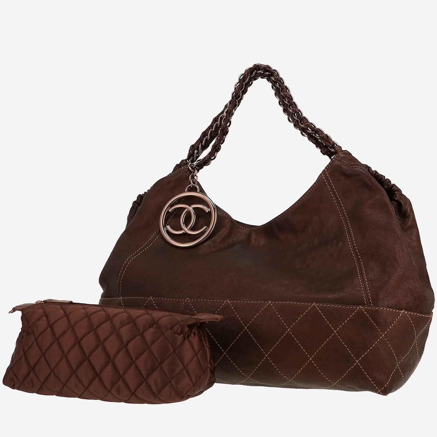 Magnifica borsa Chanel Coco cabas in pelle marrone, inserti in metallo argentato, doppia tracolla a catena in metallo dorato con intrecci di pelle marrone da portare a mano o in spalla.