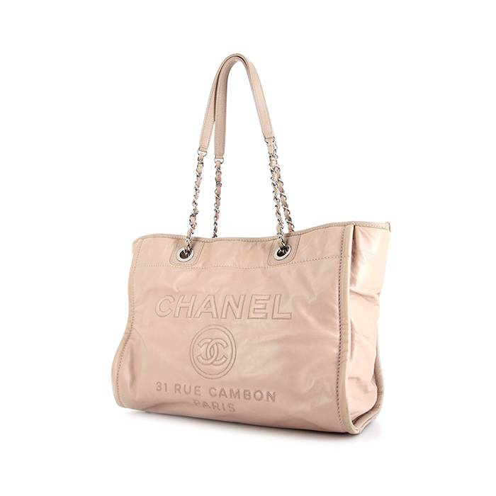 Raffinata shopping bag Chanel Deauville in pelle trapuntata rosa pallido, inserti in metallo argentato, doppia tracolla a catena in metallo argentato con intrecci di pelle rosa pallido da portare a mano o in spalla.