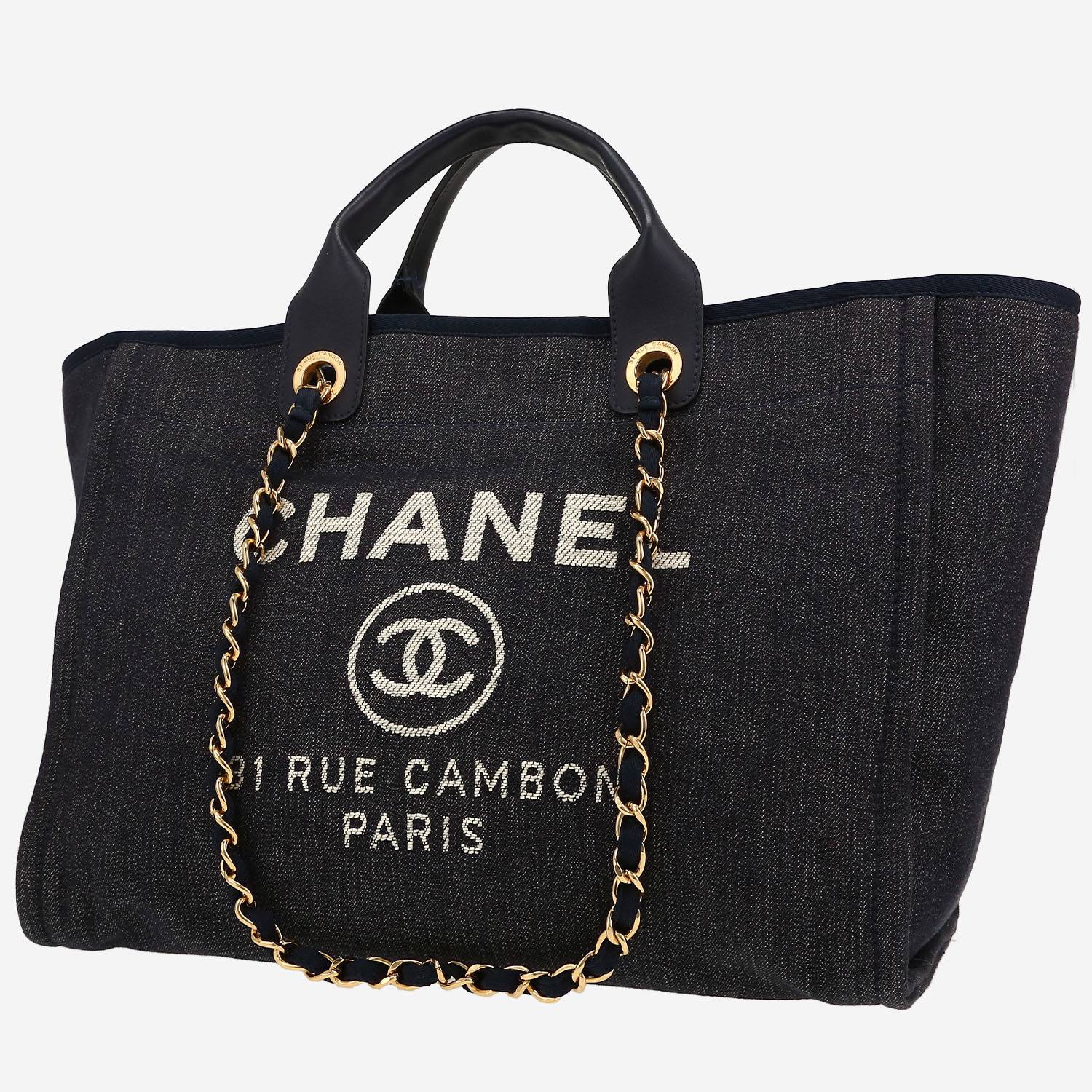 Pratica shopping bag Chanel Deauville in tela blu marino e pelle blu marino, inserti in metallo dorato, doppio manico in pelle blu marino, doppia tracolla a catena in metallo dorato con intrecci di pelle blu marino da portare a mano o in spalla.