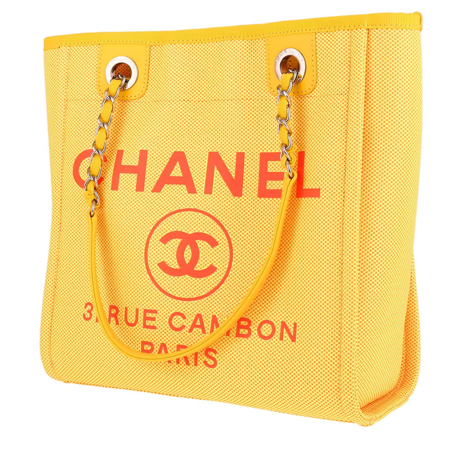 Straordinaria shopping bag Chanel Deauville modello piccolo in tela giallo, inserti in metallo argentato, doppia tracolla a catena in metallo argentato con intrecci di tela gialla.