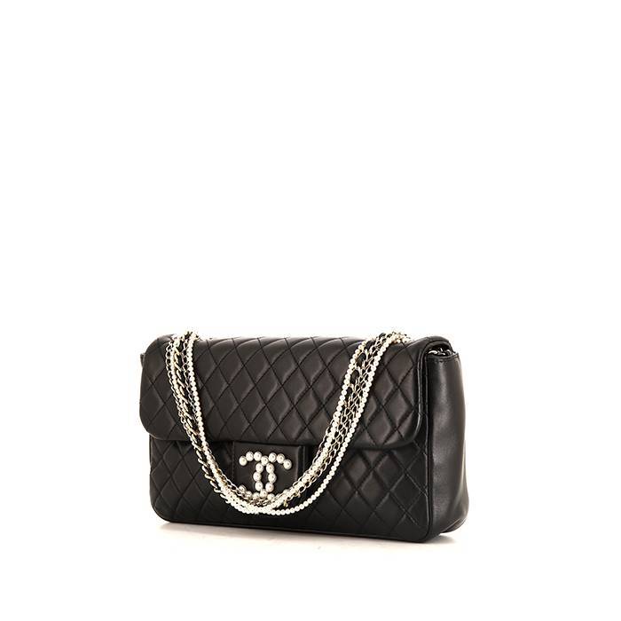 Incantevole borsa Chanel Editions Limitées in pelle trapuntata nera, inserti in metallo argentato, una tracolla a catena in metallo argentato con intrecci di pelle nera da portare a mano o in spalla.