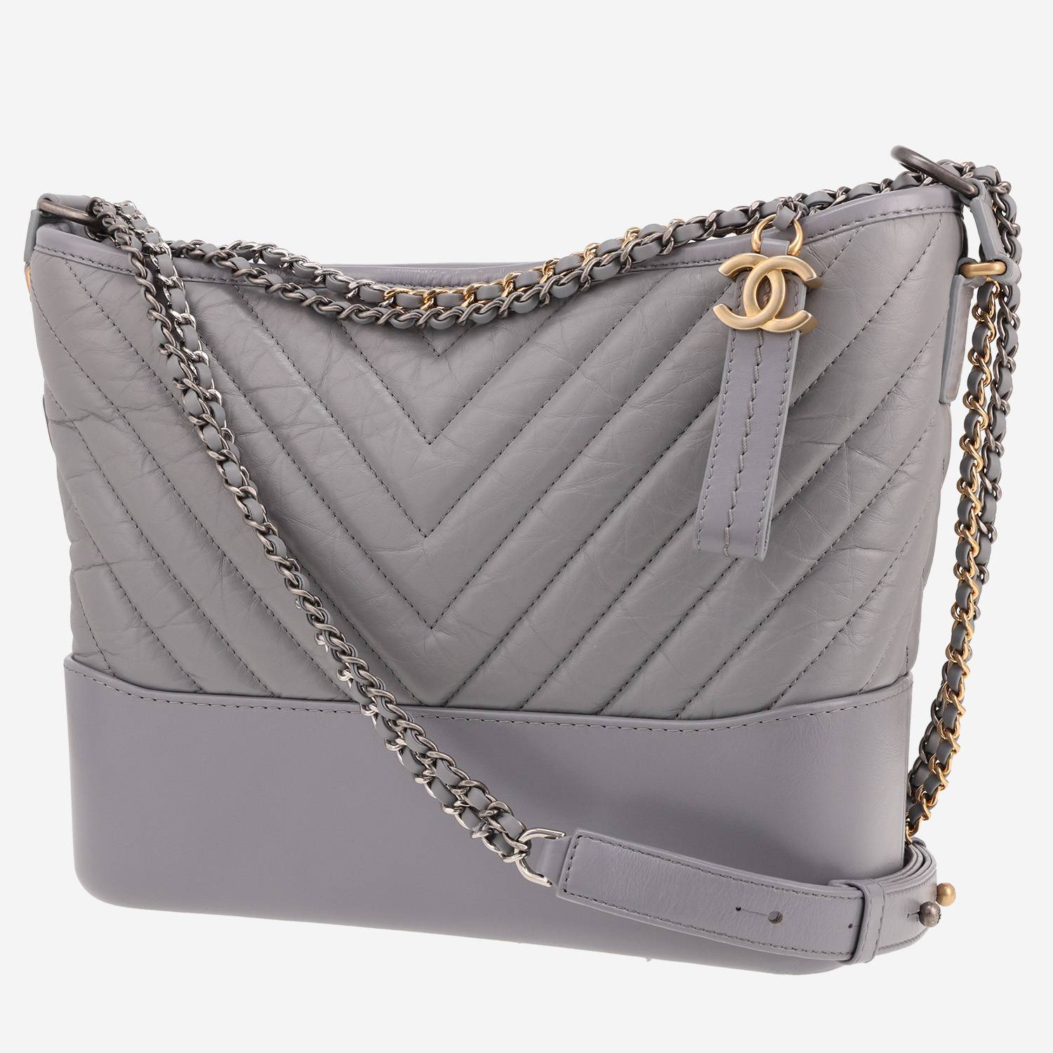 Elegante borsa a tracolla Chanel Gabrielle modello medio in pelle trapuntata a zigzag grigio, inserti in metallo dorato e argentato, doppia tracolla a catena in metallo dorato e argentato con intrecci di pelle grigia da portare in spalla o a tracolla.