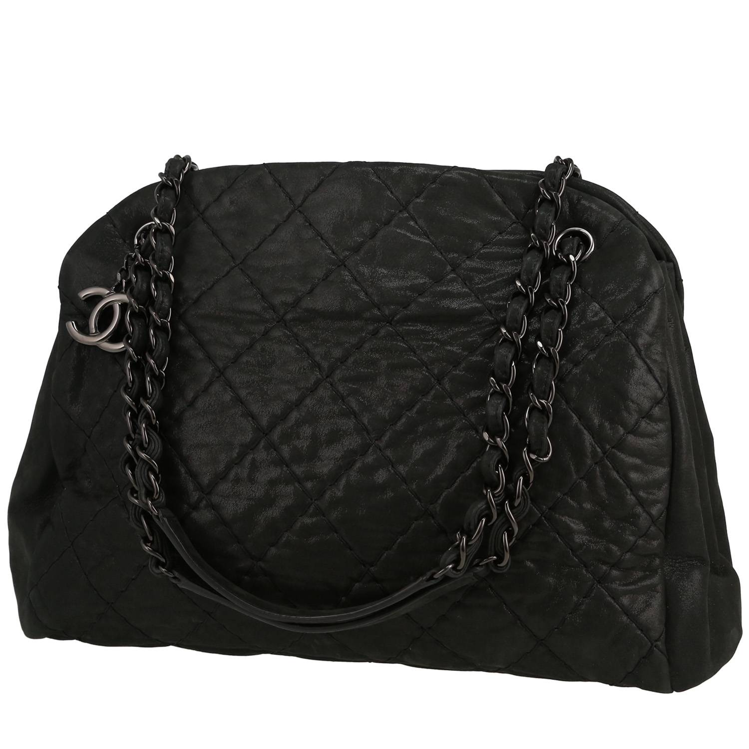 Incantevole borsa Chanel Mademoiselle in pelle iridescente nero, inserti in metallo invecchiato, doppia tracolla a catena trasformabile in metallo invecchiato con intrecci di pelle iridescente nera da portare a mano o in spalla.