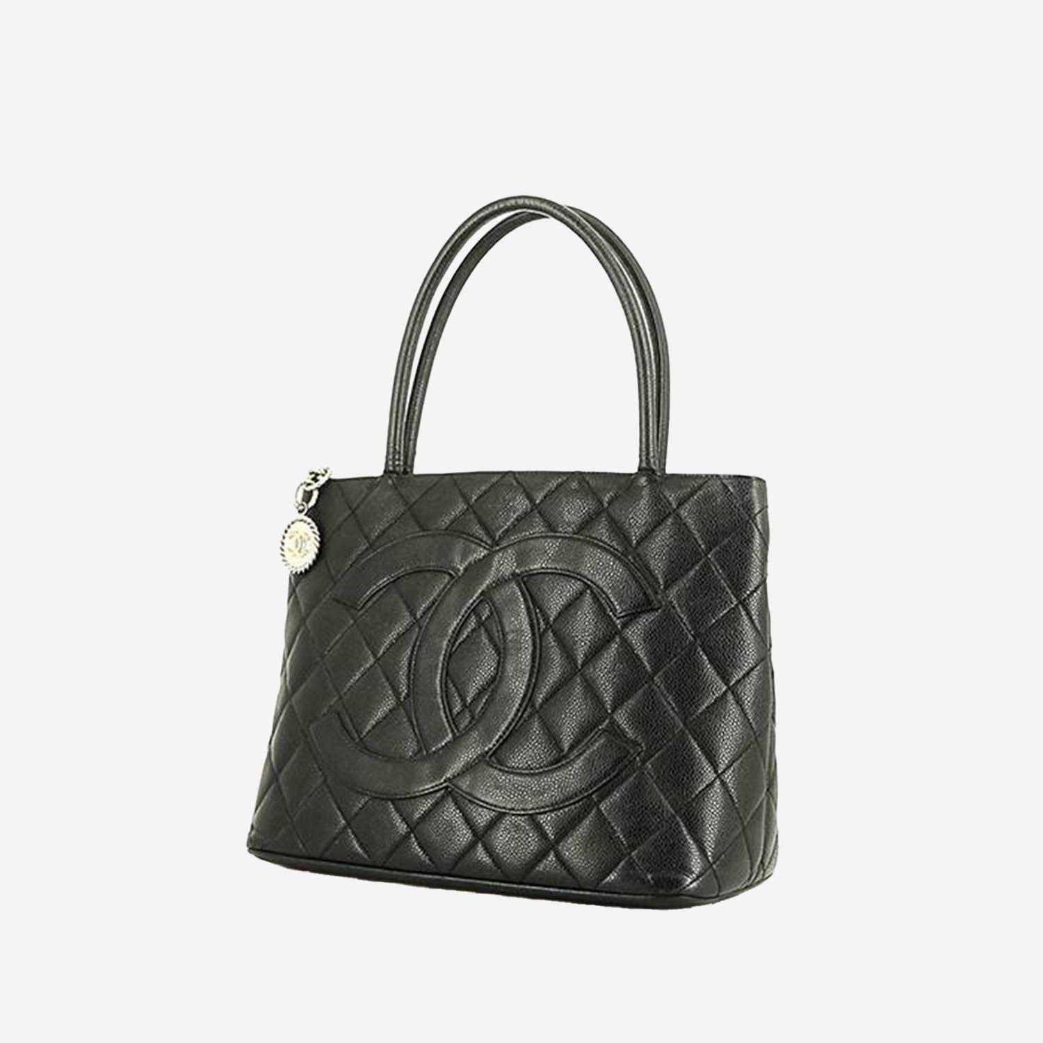 Incantevole borsa Chanel Medaillon in pelle martellata e trapuntata nero, inserti in metallo argentato, doppio manico in pelle nera da portare a mano.