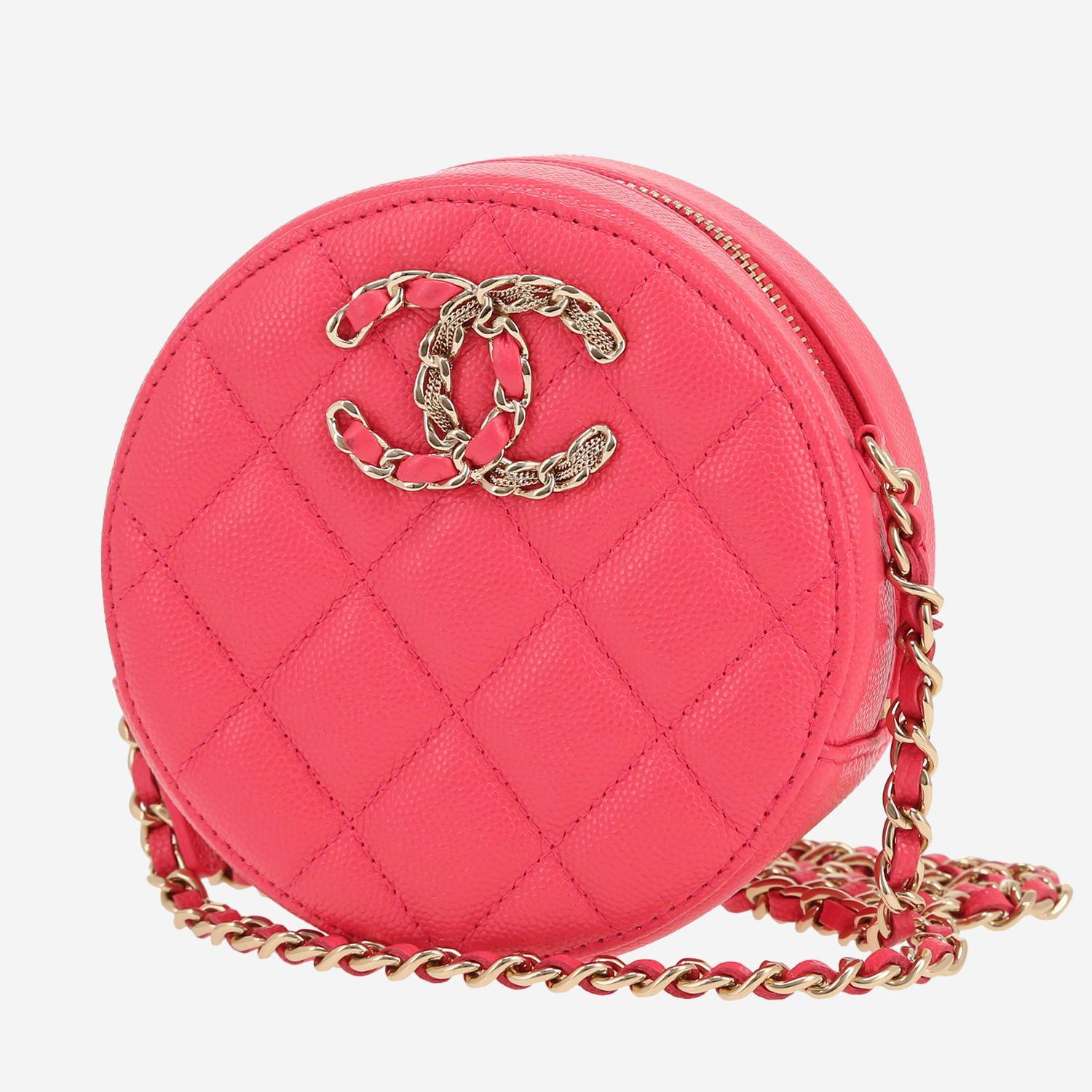 Divertente borsa a tracolla Chanel Round on Earth in pelle martellata e trapuntata rosa, inserti in vacchetta, una tracolla in metallo dorato con intrecci di pelle rosa da portare in spalla o a tracolla.