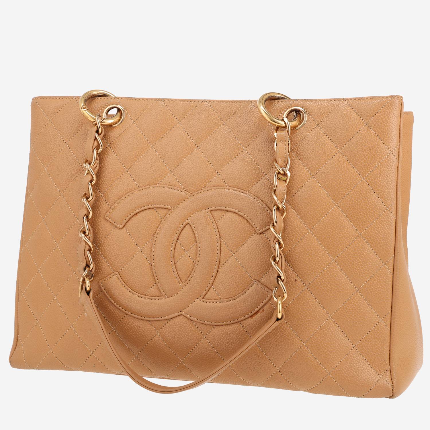 Pratica borsa Chanel Shopping GST in pelle martellata e trapuntata beige, inserti in metallo dorato, doppia tracolla a catena in metallo dorato con intrecci di pelle beige da portare a mano o in spalla.