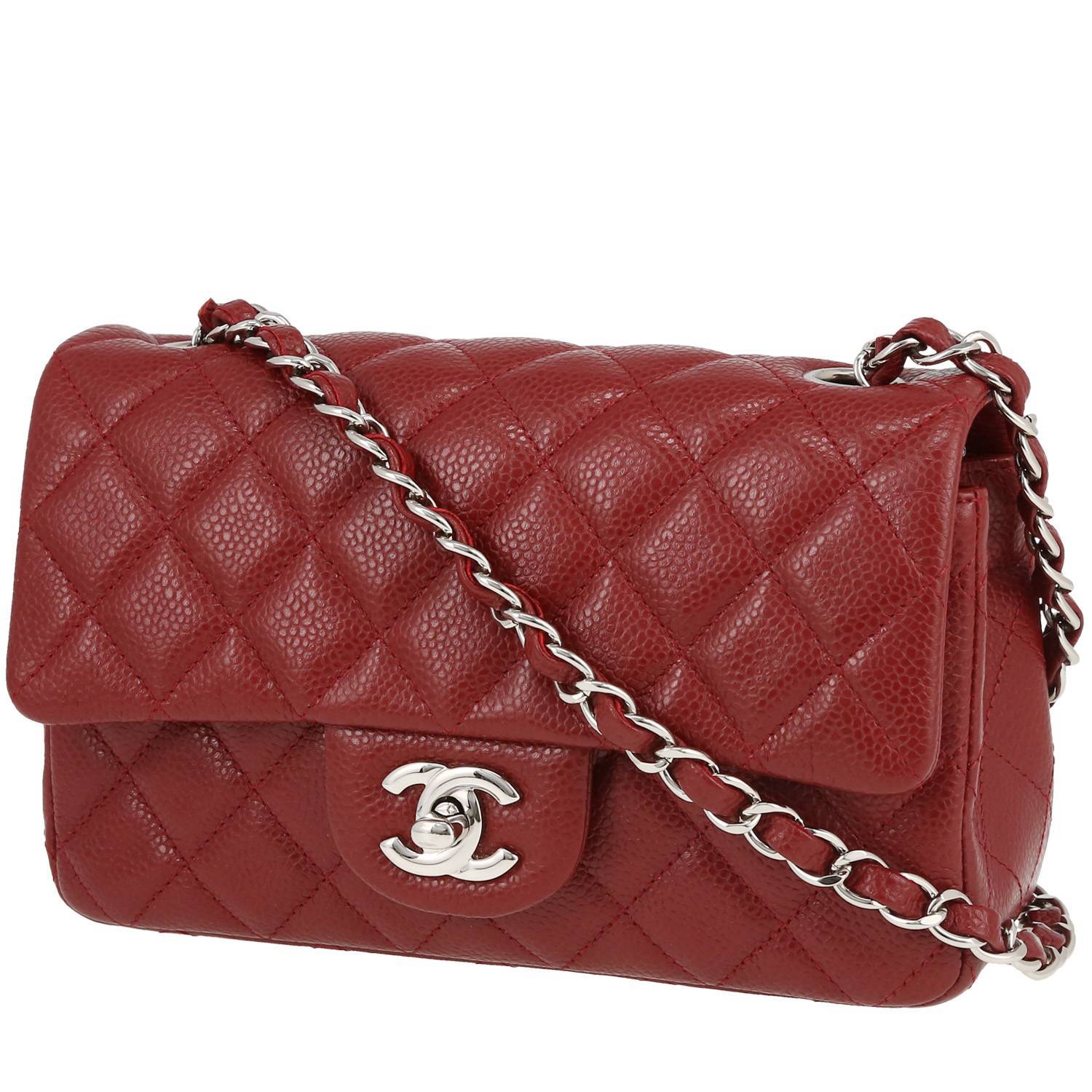 Splendida borsa a tracolla Chanel Mini Timeless in pelle martellata e trapuntata rosso, inserti in metallo argentato, tracolla a catena in metallo argentato con intrecci di pelle rossa da portare in spalla o a tracolla.