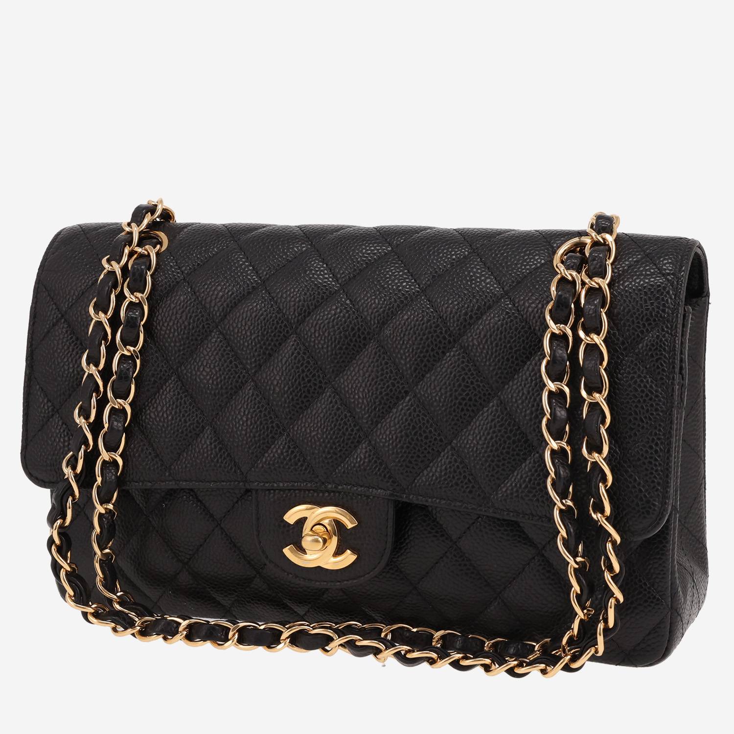 Magnifica borsa Chanel Timeless Classic in pelle martellata e trapuntata nero, inserti in metallo dorato, una tracolla a catena trasformabile in metallo dorato con intrecci di pelle nera da portare a mano o in spalla.