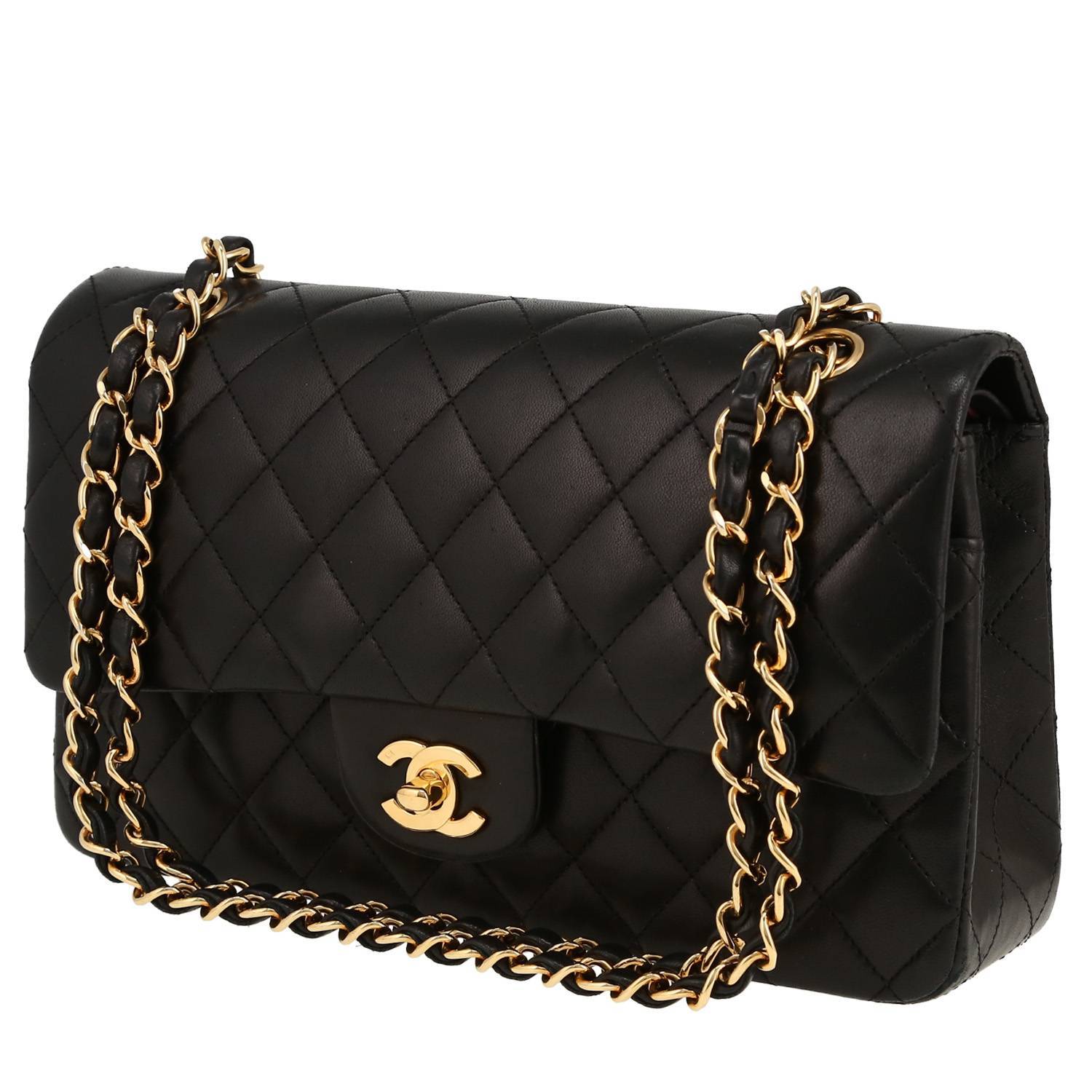 Splendida borsa Chanel Timeless Classic in pelle trapuntata nero, inserti in metallo dorato, tracolla a catena in metallo dorato con intrecci di pelle nera da portare a mano o in spalla.