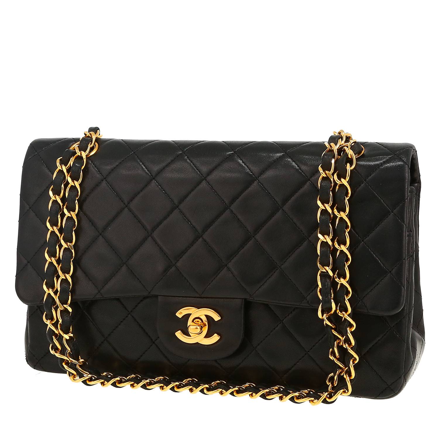 Inimitabile borsa Chanel Timeless Classic in pelle trapuntata nero, inserti in metallo dorato, una tracolla a catena in metallo dorato con intrecci di pelle nera da portare a mano o in spalla.