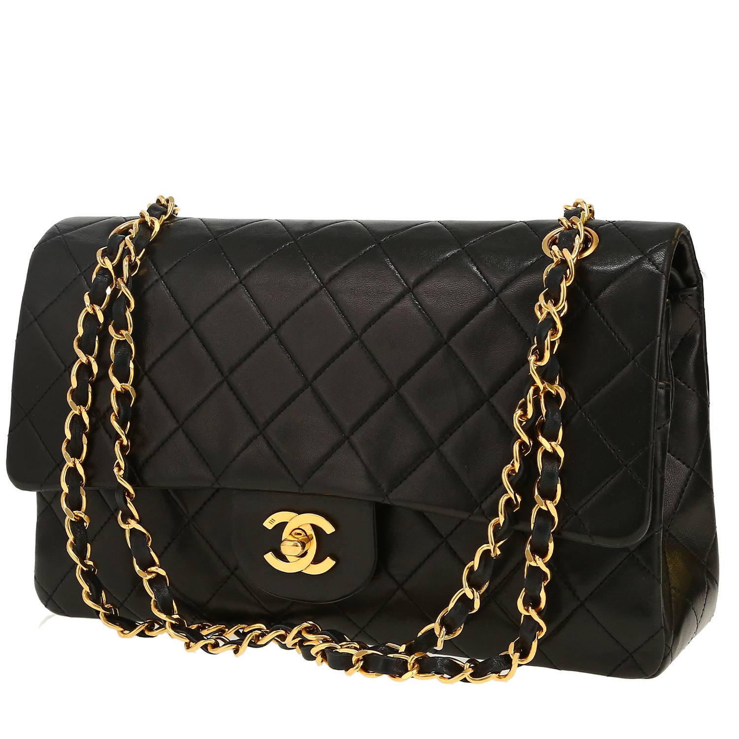Magnifica borsa Chanel Timeless Classic in pelle trapuntata nero, inserti in metallo dorato, una tracolla a catena in metallo dorato con intrecci di pelle nera da portare a mano o in spalla.