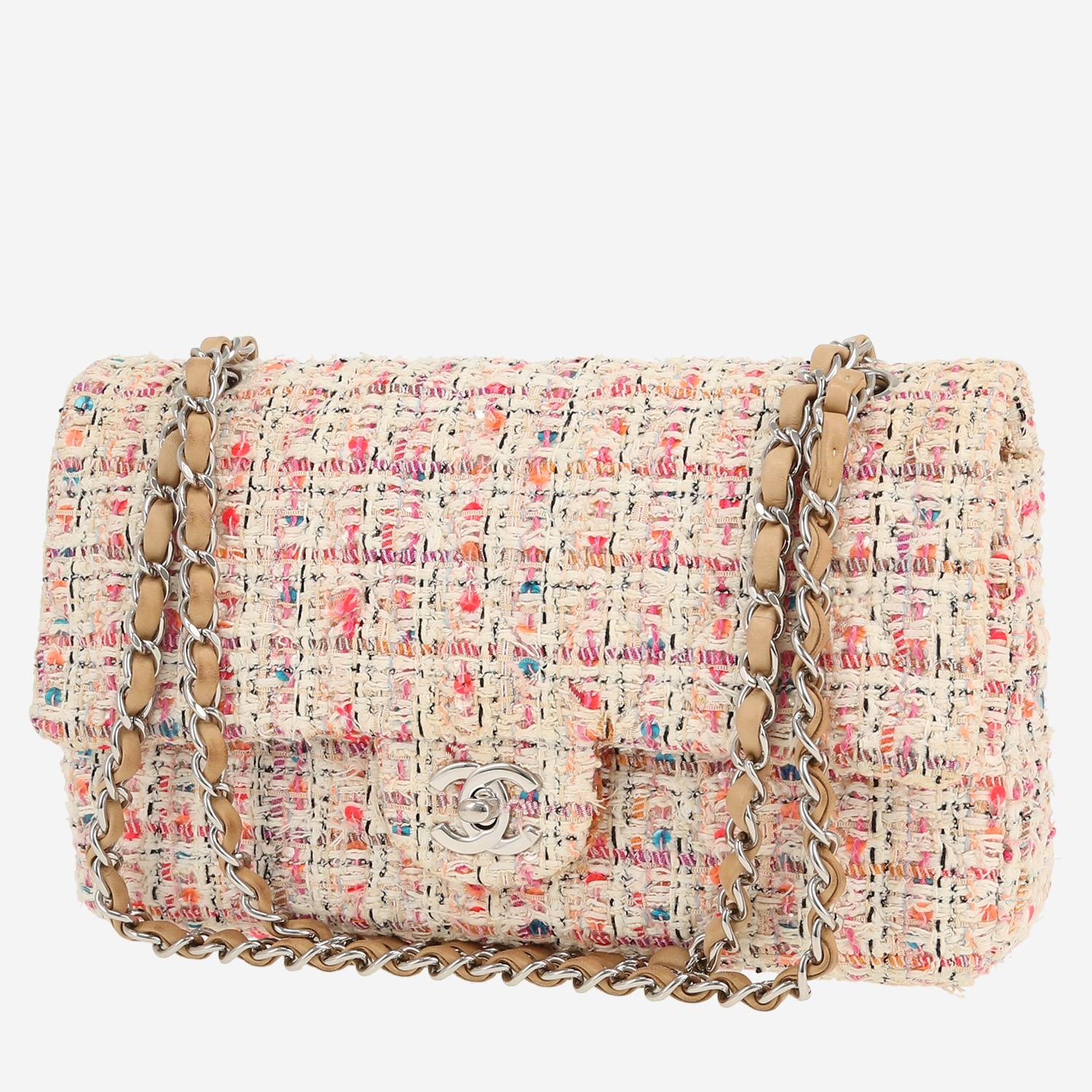 Magnifica borsa Chanel Timeless Classic in tweed beige e rosa, inserti in metallo argentato, una tracolla a catena trasformabile in metallo argentato con intrecci di pelle beige da portare a mano o in spalla.