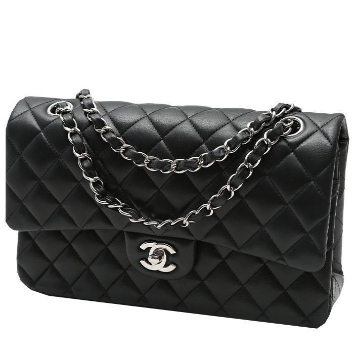 Elegante borsa Chanel Timeless Classic modello medio in pelle trapuntata nero, inserti in metallo argentato, una tracolla a catena in metallo argentato con intrecci di pelle nera da portare a mano o in spalla.
