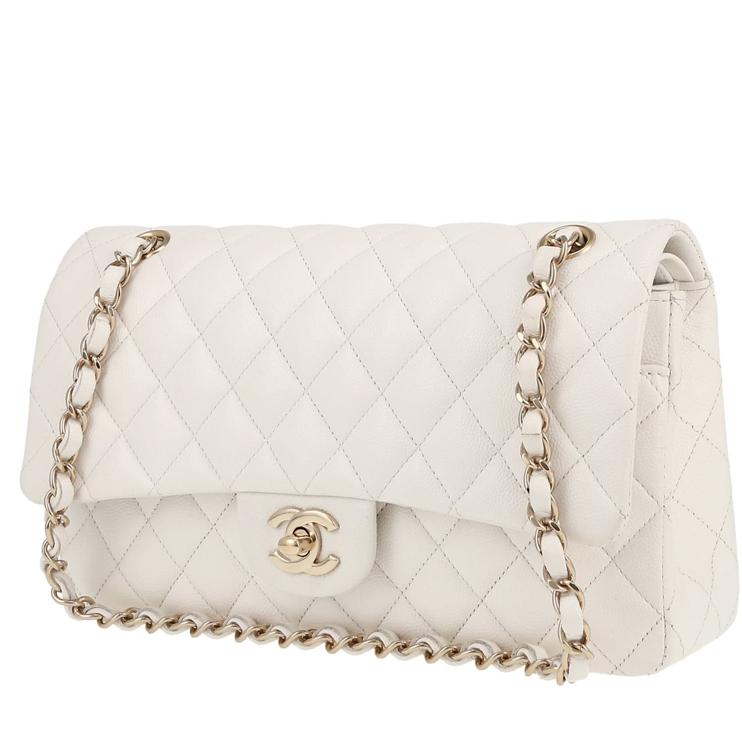 Elegante borsa Chanel Timeless in pelle martellata e trapuntata bianco, inserti in metallo dorato, una tracolla a catena in metallo dorato con intrecci di pelle bianca da portare a mano o in spalla.