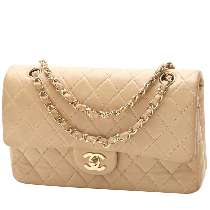 Elegante borsa Chanel Timeless in pelle trapuntata beige, inserti in metallo dorato, una tracolla a catena trasformabile in metallo dorato con intrecci di pelle beige da portare a mano o in spalla.