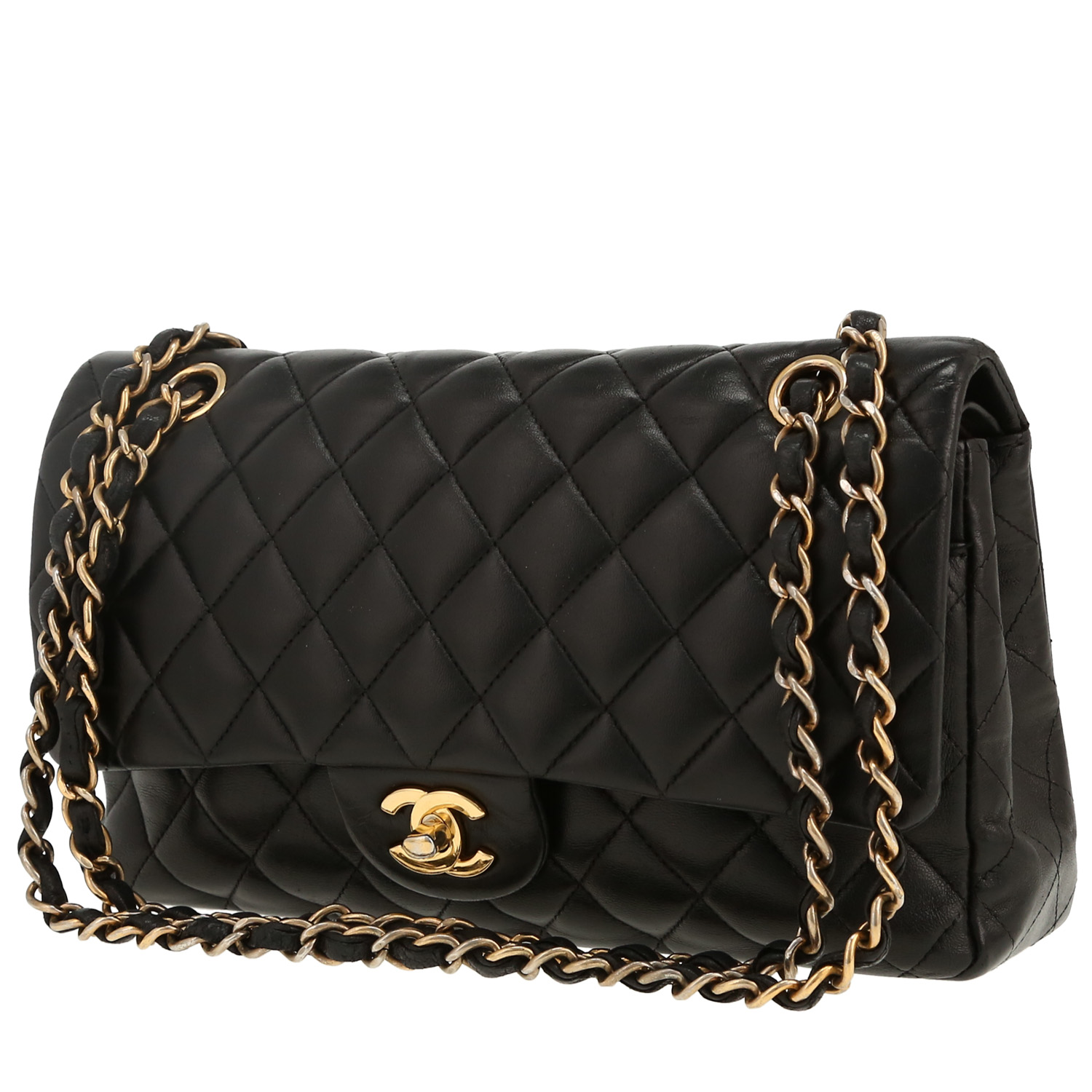 Famosa borsa Chanel Timeless Classic in pelle trapuntata nero, inserti in metallo dorato, una tracolla a catena trasformabile in metallo dorato con intrecci di pelle nera.