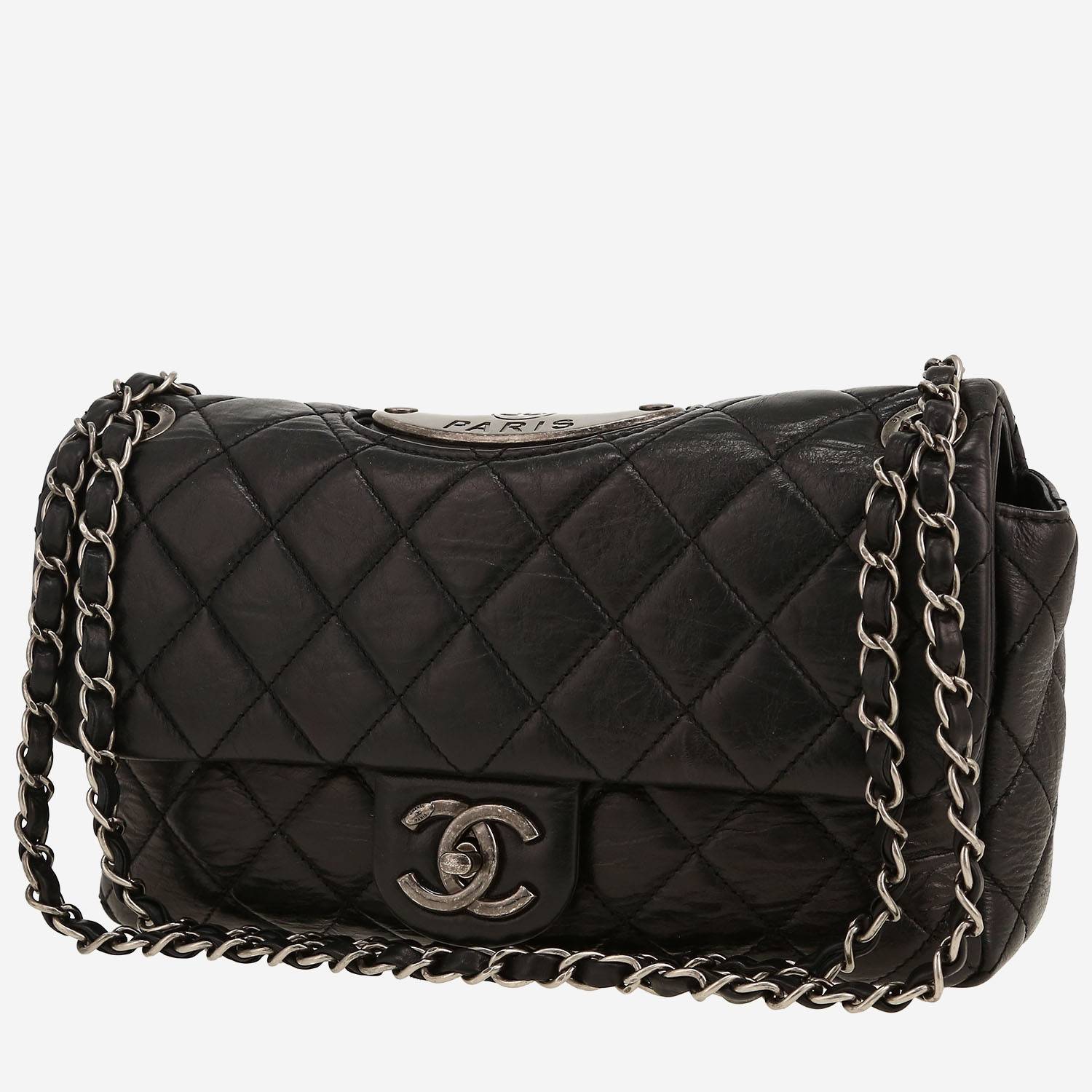Elegante borsa Chanel Timeless in pelle trapuntata nero, inserti in metallo argentato invecchiato, una tracolla a catena in metallo argentato invecchiato con intrecci di pelle nera da portare a mano o in spalla.