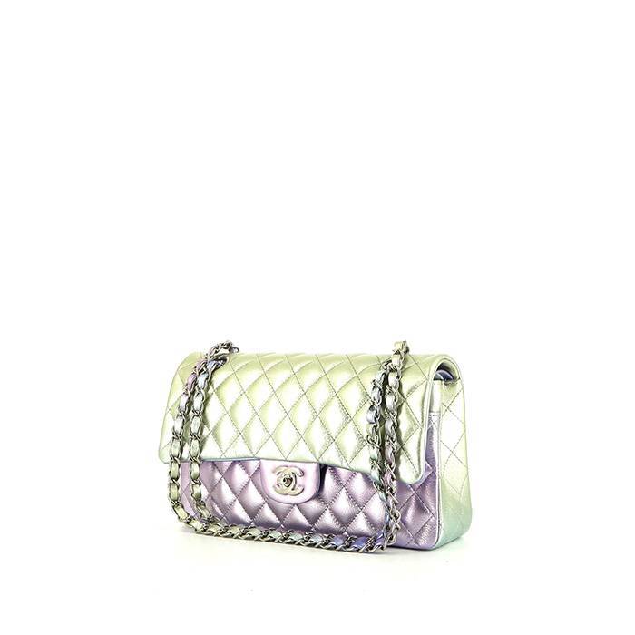Incantevole borsa Chanel Timeless in pelle trapuntata verde iridescente, inserti in metallo argentato, una tracolla a catena in metallo argentato con intrecci di pelle argentata da portare a mano o in spalla.