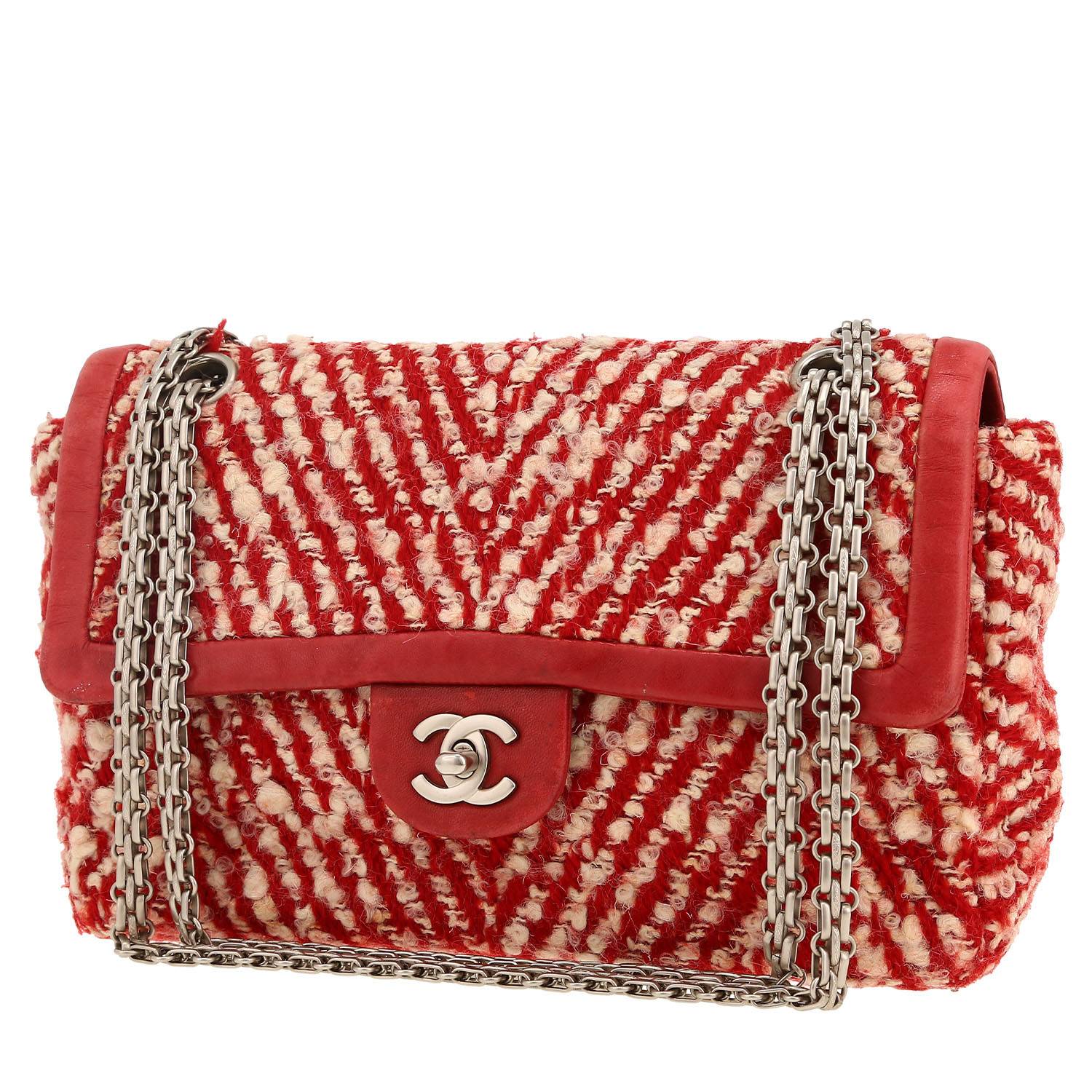 Magnifica borsa Chanel Timeless in tessuto di lana rosso e bianco, inserti in metallo argentato, una tracolla a catena in metallo argentato da portare in spalla o a tracolla.