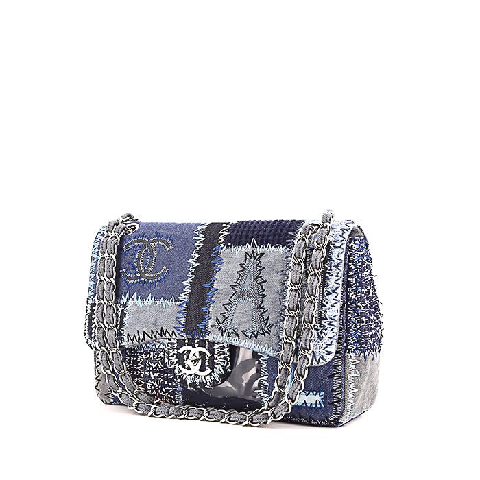 Graziosa e originale borsa Chanel Timeless jumbo in tela denim e pelle verniciata blu, inserti in metallo argentato, una tracolla a catena in metallo argentato con intrecci di tela denim blu da portare a mano o in spalla.