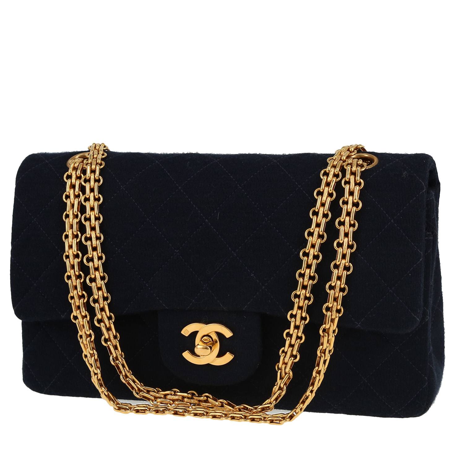 Splendida borsa Chanel Timeless Petit in jersey trapuntato blu marino, inserti in metallo dorato, una tracolla a catena in metallo dorato da portare a mano o in spalla.