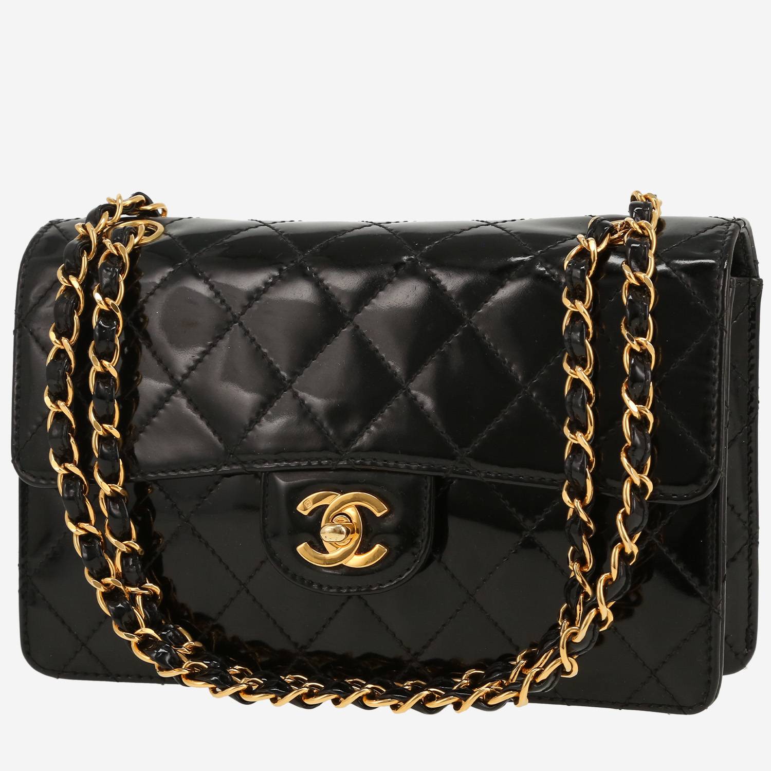 Inimitabile borsa Chanel Timeless Petit in pelle verniciata e foderata nero, inserti in metallo dorato, una tracolla a catena trasformabile in metallo dorato con intrecci di pelle verniciata nera da portare a mano o in spalla.