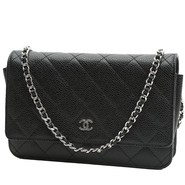 Inimitabile borsa a tracolla Chanel Wallet on Chain in pelle martellata e trapuntata nero, inserti in metallo argentato, una tracolla a catena trasformabile in metallo argentato con intrecci di pelle nera da portare a mano, in spalla o a tracolla.