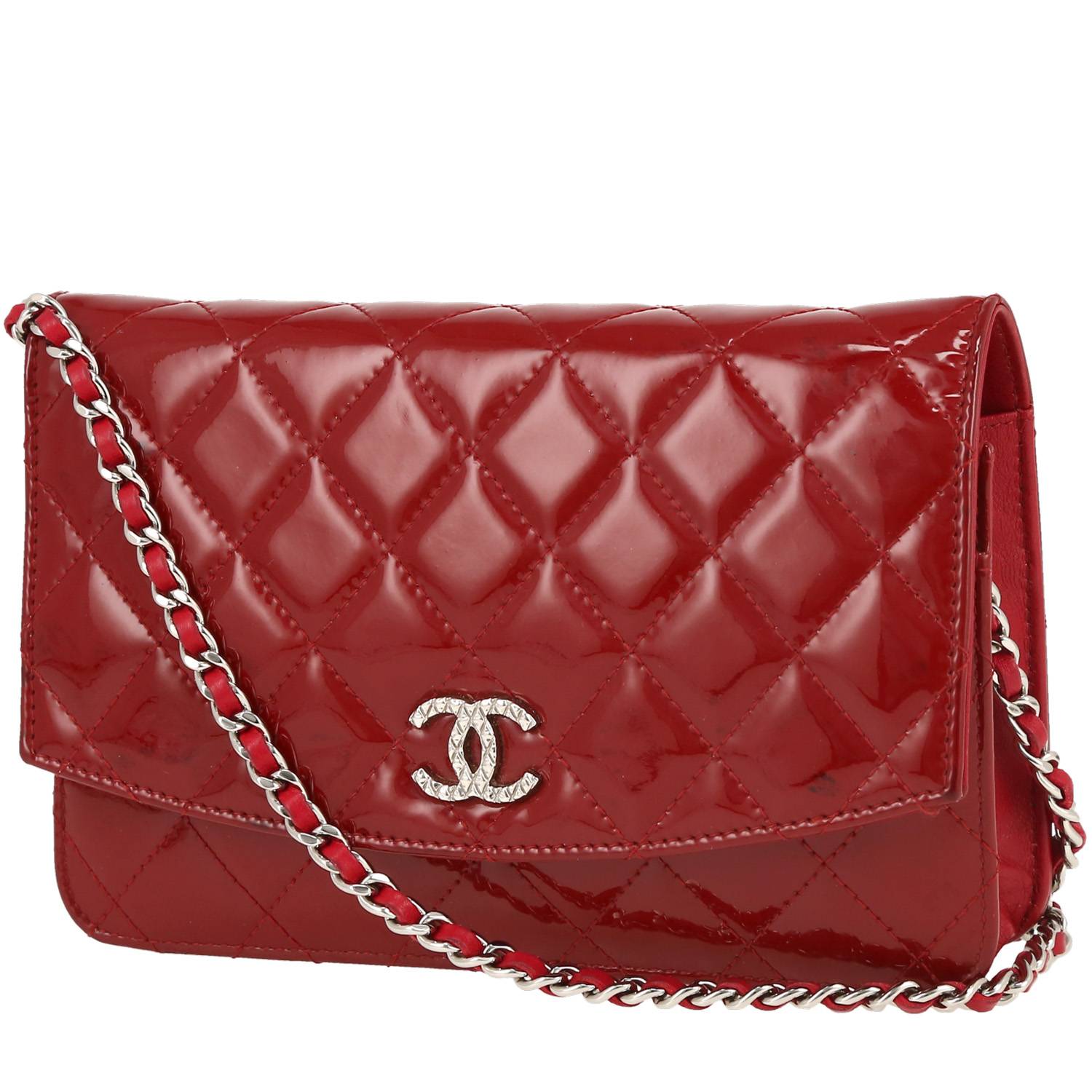 Incantevole borsa a tracolla Chanel Wallet on Chain in pelle verniciata e foderata rosso, inserti in metallo argentato, una tracolla a catena trasformabile in metallo argentato con intrecci di pelle rossa da portare a mano, in spalla o a tracolla.