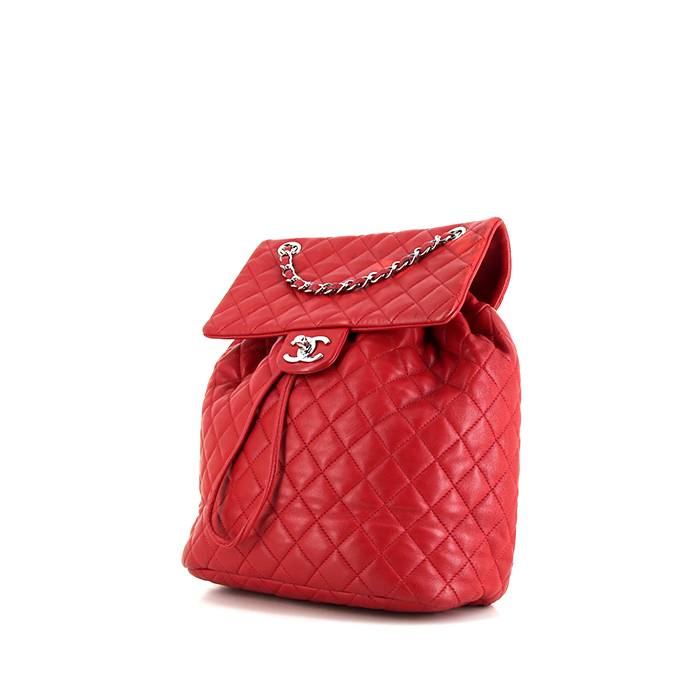Bello zaino Chanel in pelle trapuntata rossa, inserti in metallo argentato, doppia tracolla a catena trasformabile in metallo argentato con intrecci di pelle rossa da portare a mano o in spalla.