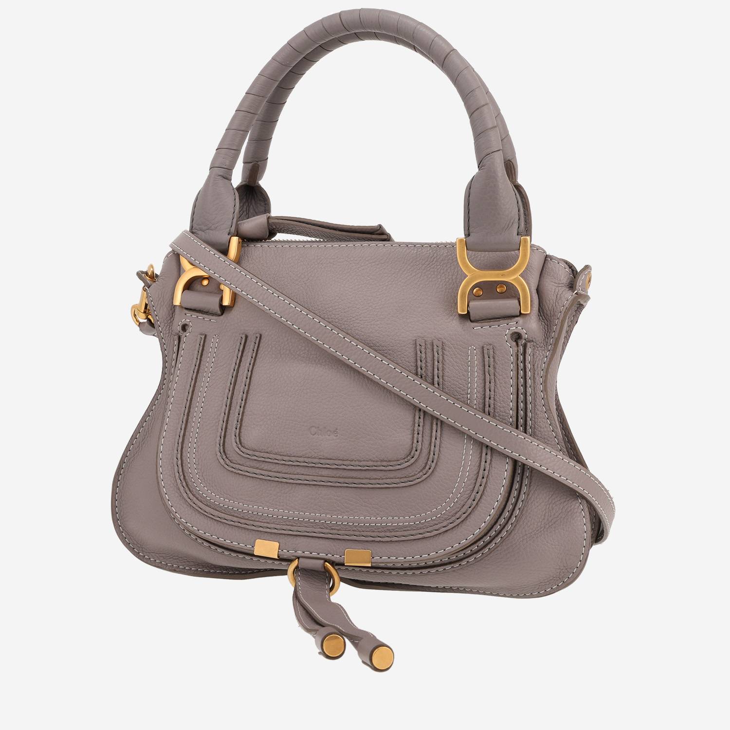 Borsa Chloé Marcie in pelle martellata grigio, inserti in metallo dorato, doppio manico in pelle grigia, una tracolla removibile in pelle grigia da portare a mano, in spalla o a tracolla.