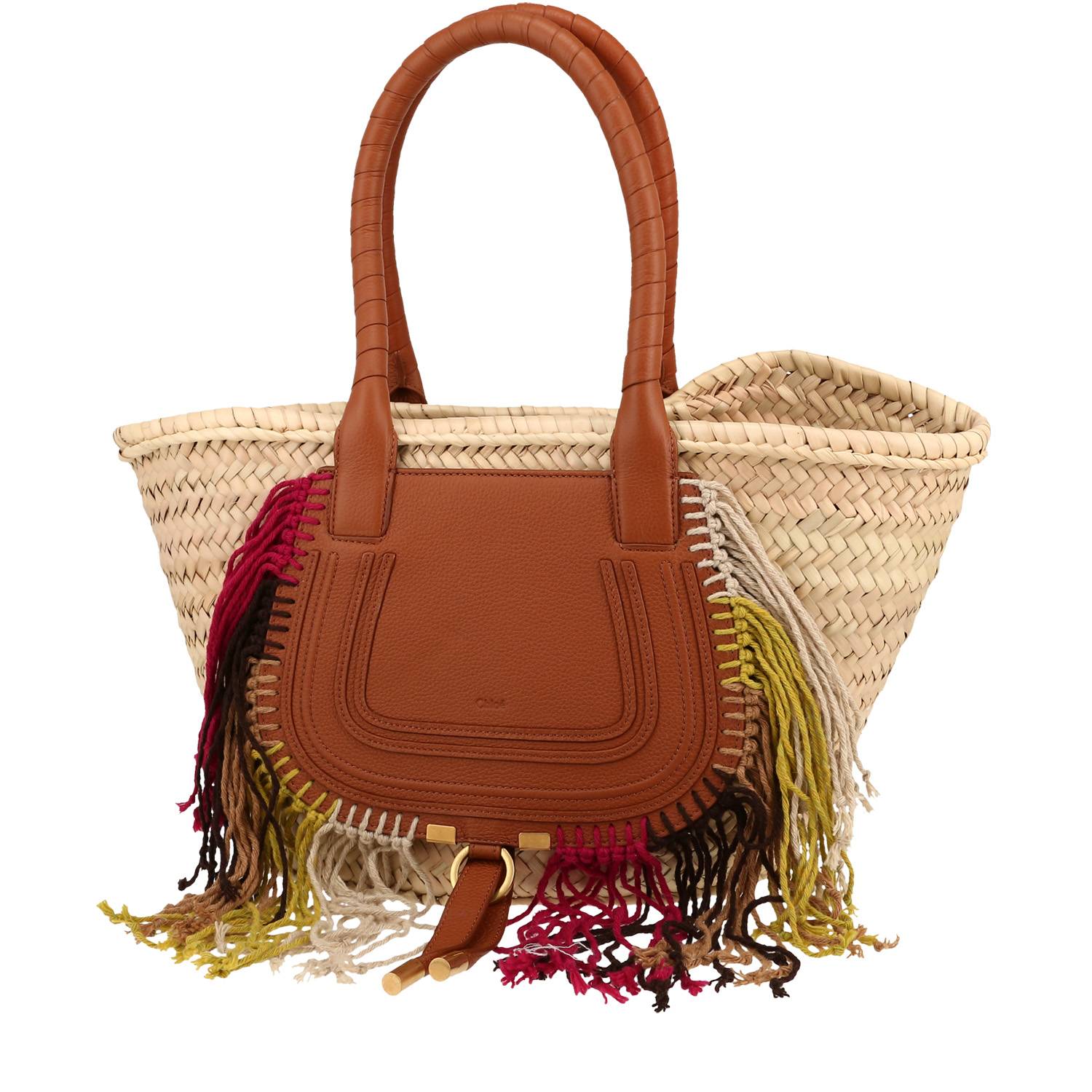 Magnifica shopping bag Chloé Marcie beige con motivo con trecce e pelle gold, inserti in metallo dorato, doppio manico in pelle marrone da portare a mano o in spalla.